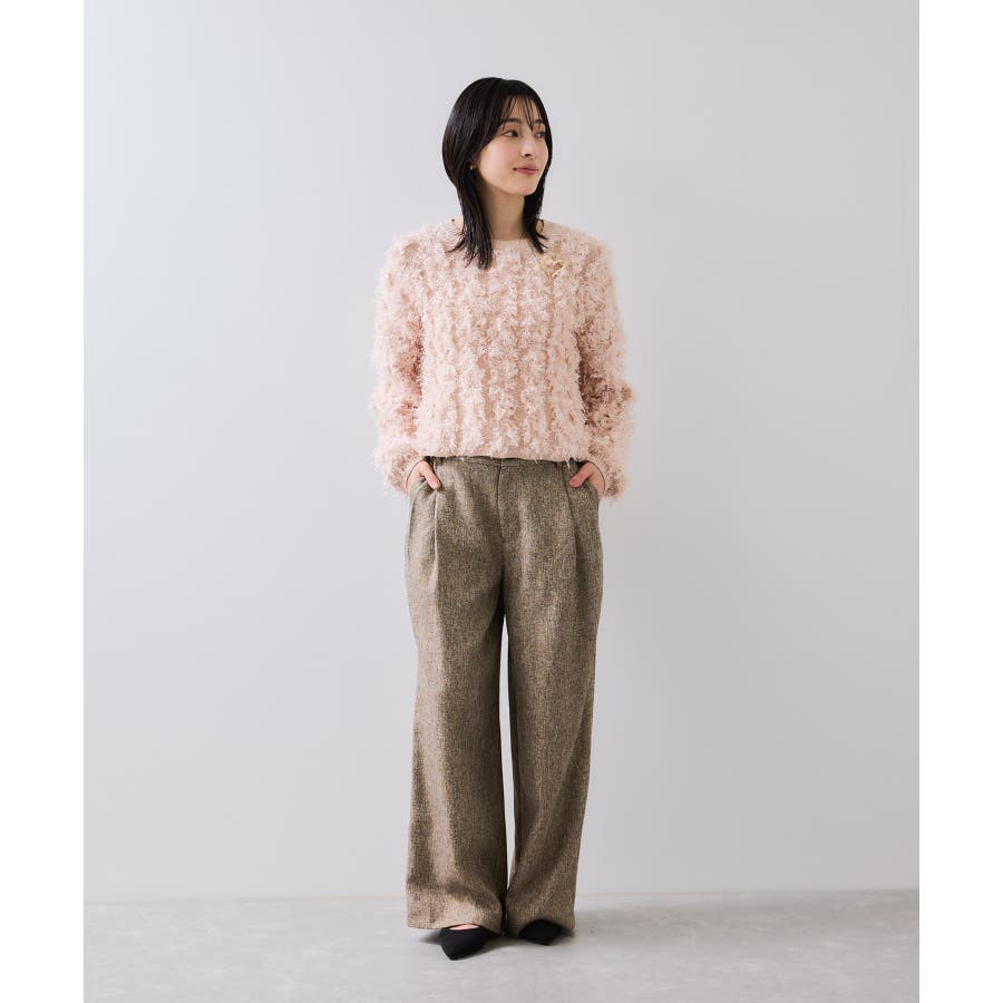 トップスはビスチェドッキングブラウス(BVH45080)やフリルシアーチェックブラウス(BVH45090)などの華やぎのあるトップスに、アソートパール釦カーディガン(BVK45060)を羽織らせたり、フェミニンハンサムに着こなすのがおすすめ。