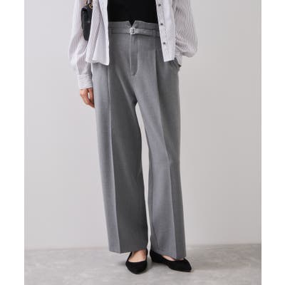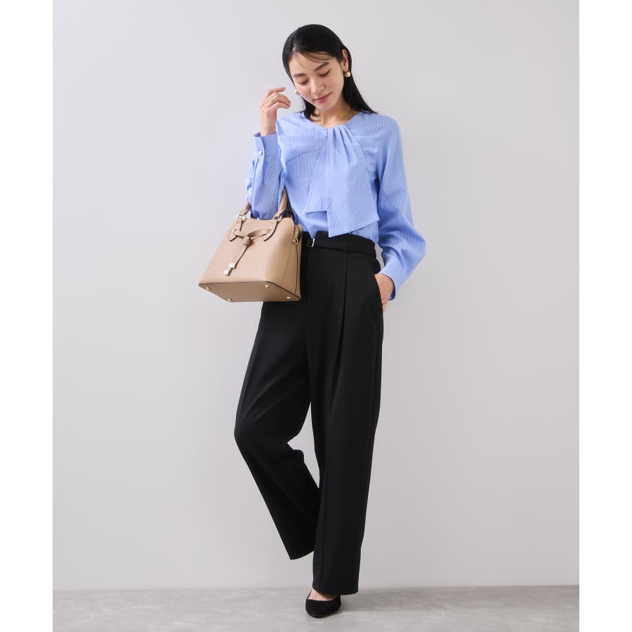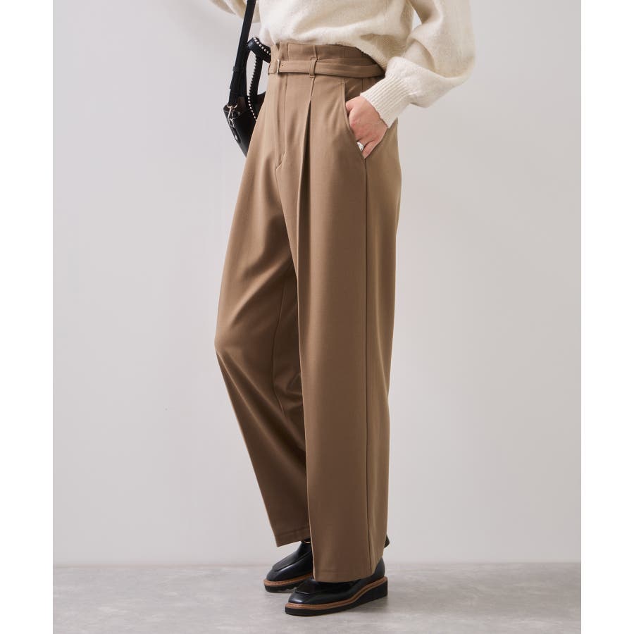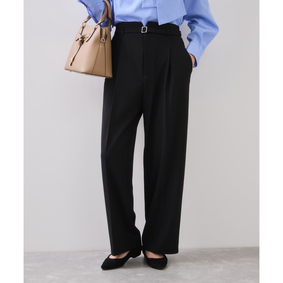 すっきりとしたストレートシルエットですが、タックを入れているので腰回りはややゆとりがあります。後ろサイドにこっそりゴムを入れ履き心地と美シルエットに拘ったパンツです。ウエストベルト部分はカッティングを入れトップスがキレイに見えるようデザイン。ベルト付きで、ウエストに目が行きます。ベルト穴付きなので自分のサイズに調整可能です。長め丈が好きな方はワンサイズ上げてもベルトでウエストは調節可能です。