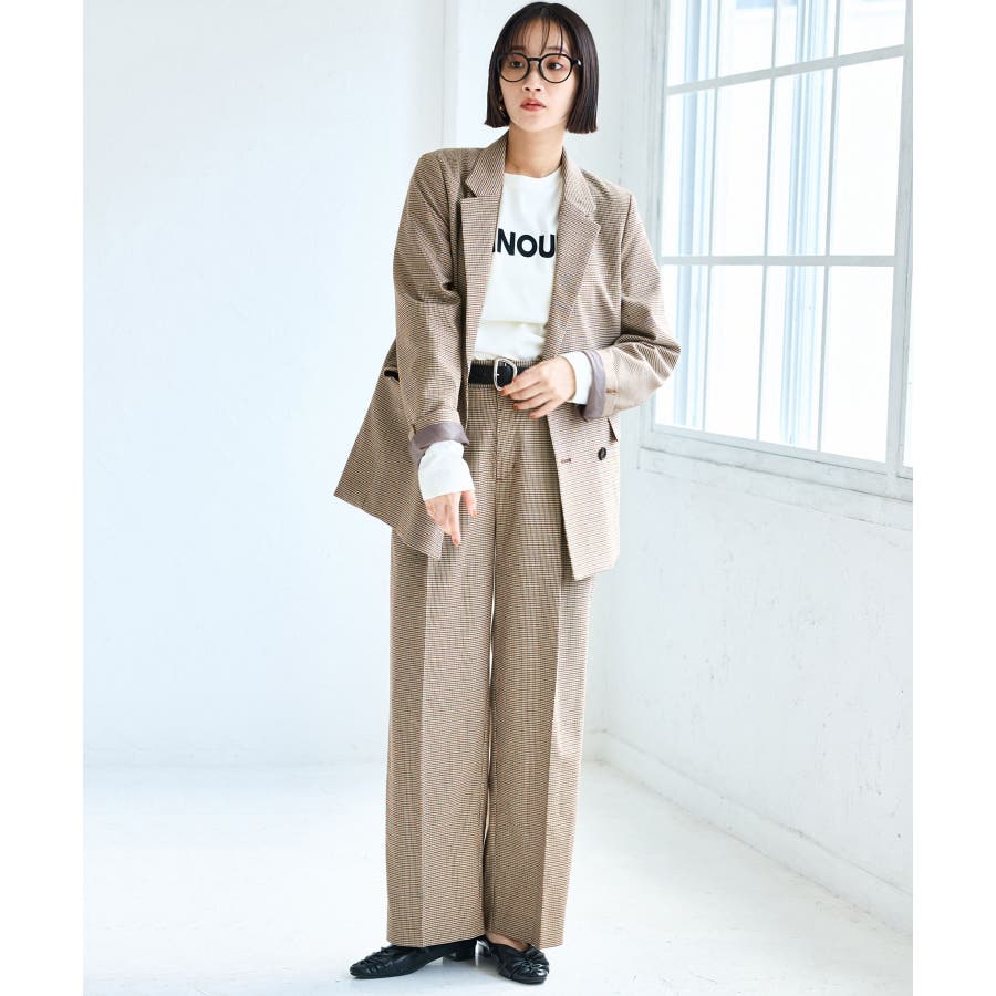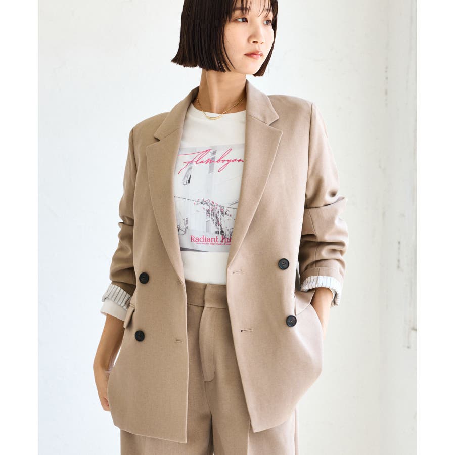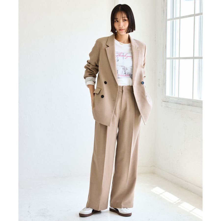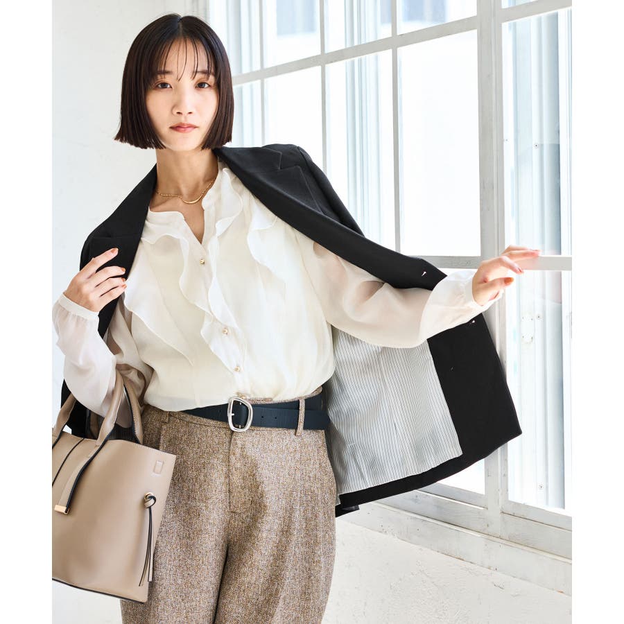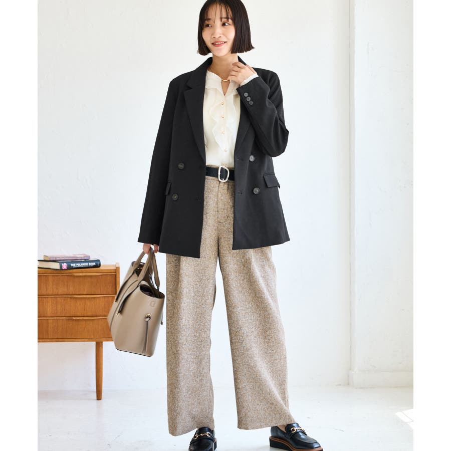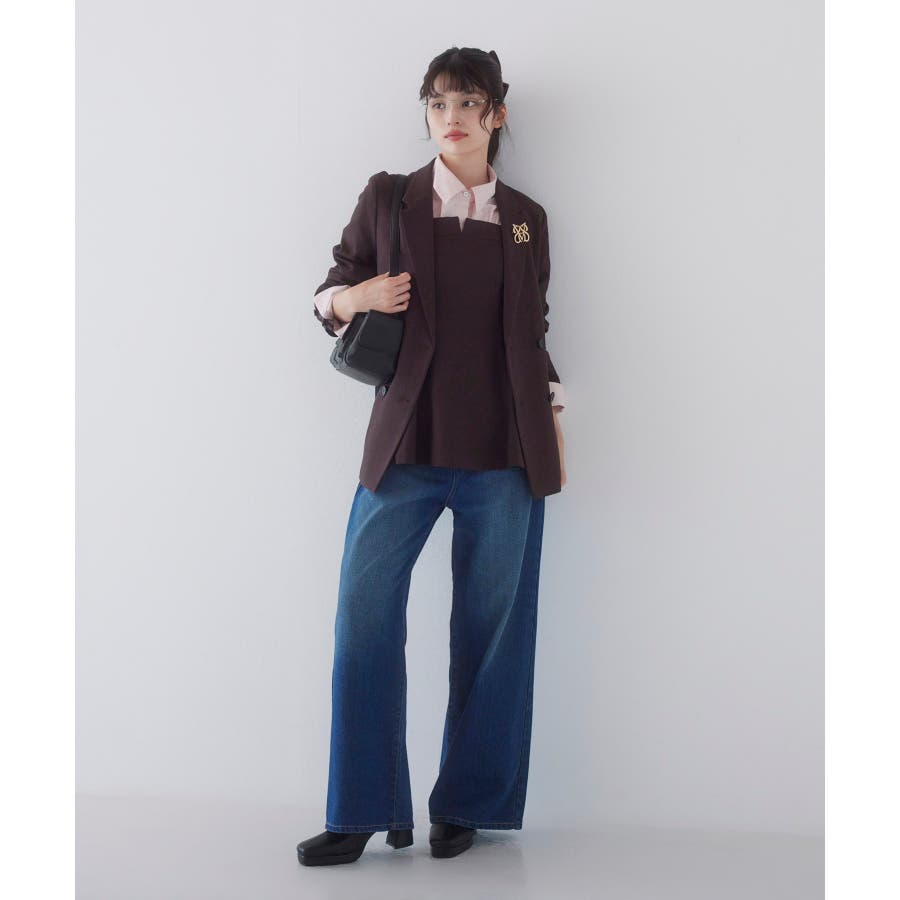 インナーにロゴロンTを着用し、ボトムはセットアップのウーリッシュワイドパンツ(品番:BVS65100)を合わせたキレイ目カジュアルがおすすめ。シアーリボンブラウス×デニムパンツに羽織として合わせることで、デートや女子会などオフシーンにも使えるジャケットとしてご活用いただけます。