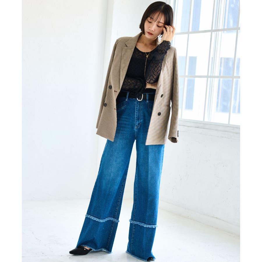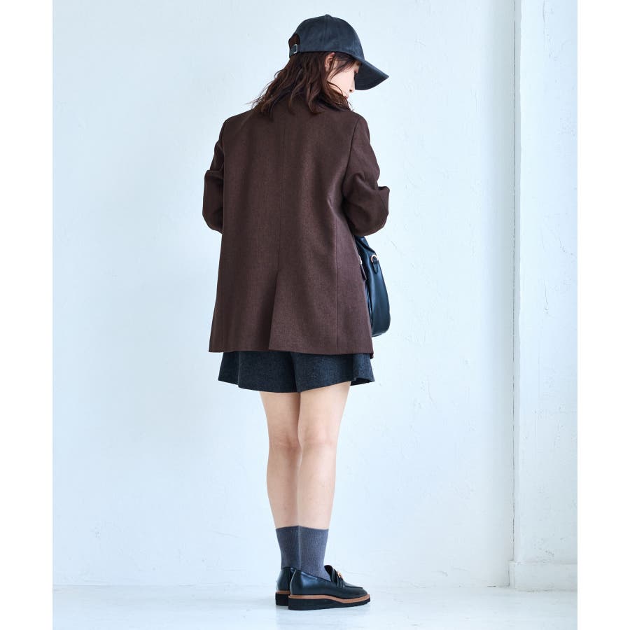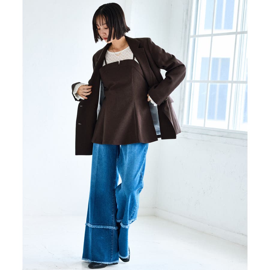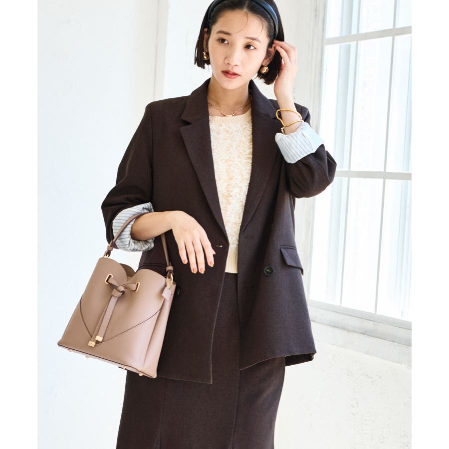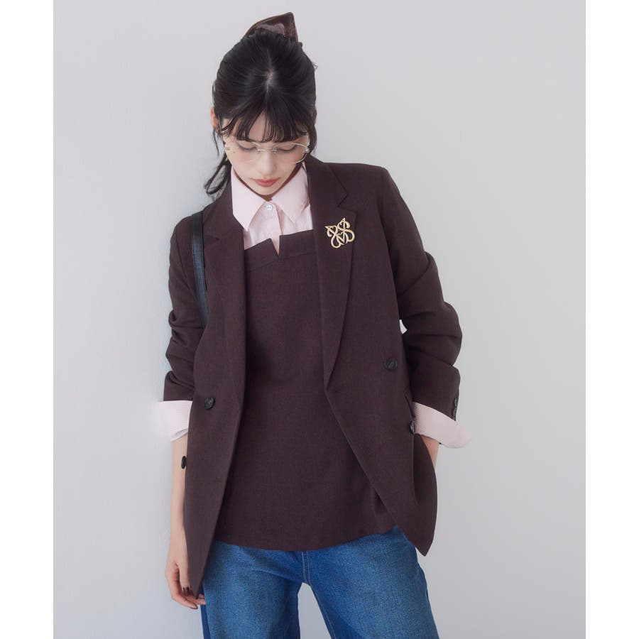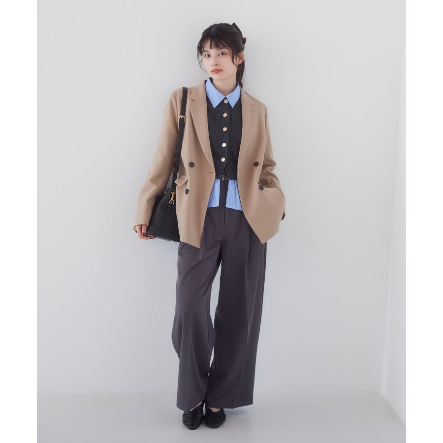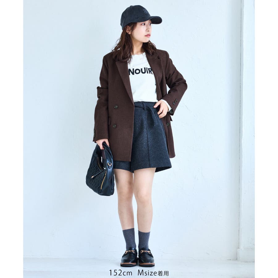 インナーにロゴロンTを着用し、ボトムはセットアップのウーリッシュワイドパンツ(品番:BVS65100)を合わせたキレイ目カジュアルがおすすめ。シアーリボンブラウス×デニムパンツに羽織として合わせることで、デートや女子会などオフシーンにも使えるジャケットとしてご活用いただけます。