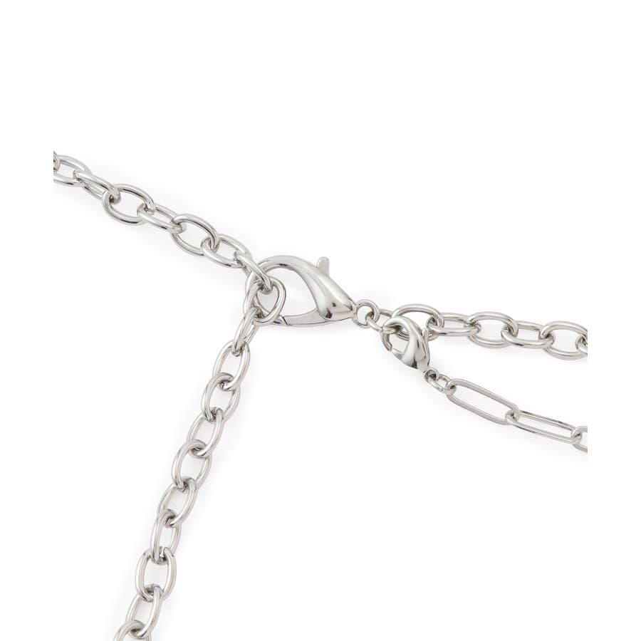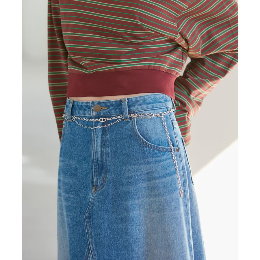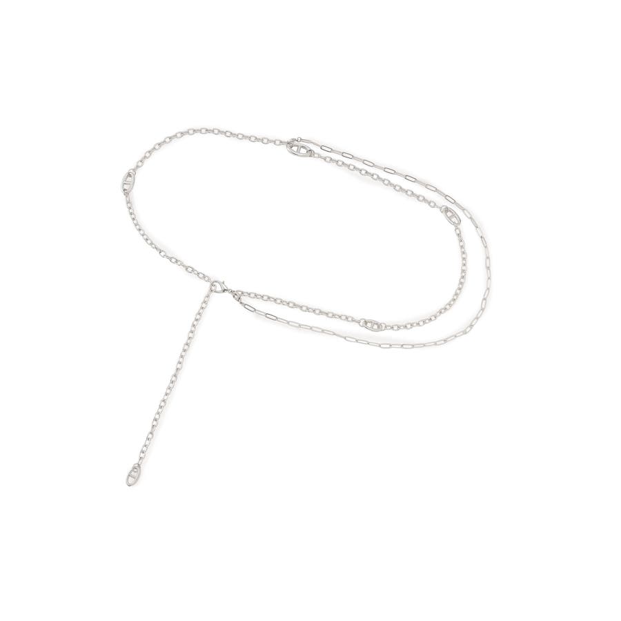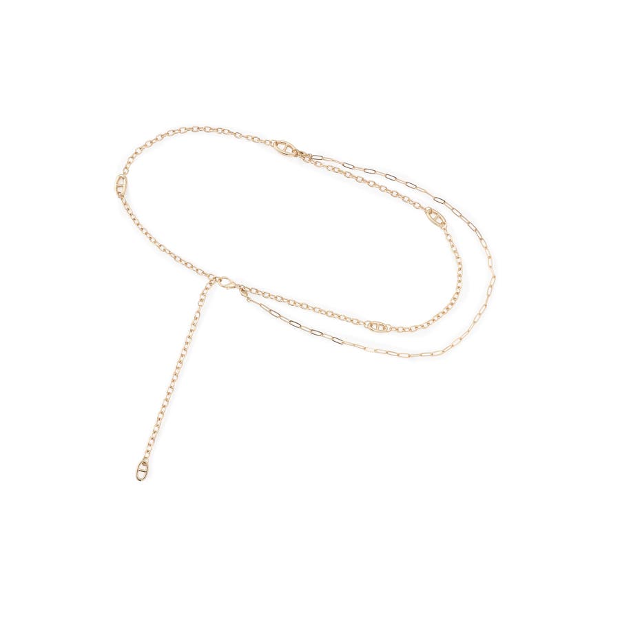 ◆2024春夏◆ 【デザイン・シルエット】 レイヤードデザインのチェーンベルト。 じゃらっと垂らすデザインで、ウェストに合わせて引っかけ金具でお好きな位置のお留めいただけます。2種類のチェーンでウェスト周りにメリハリが出て、先端にもデザインパーツが付いているので垂らした時のワンポイントになります。レイヤードチェーンは単体でもネックレスとしてご使用いただけるマルチウェイとなっております。 デニムにざっくりと合わせていただくのがおすすめです。 【カラー】 シルバーとゴールドの2色展開。