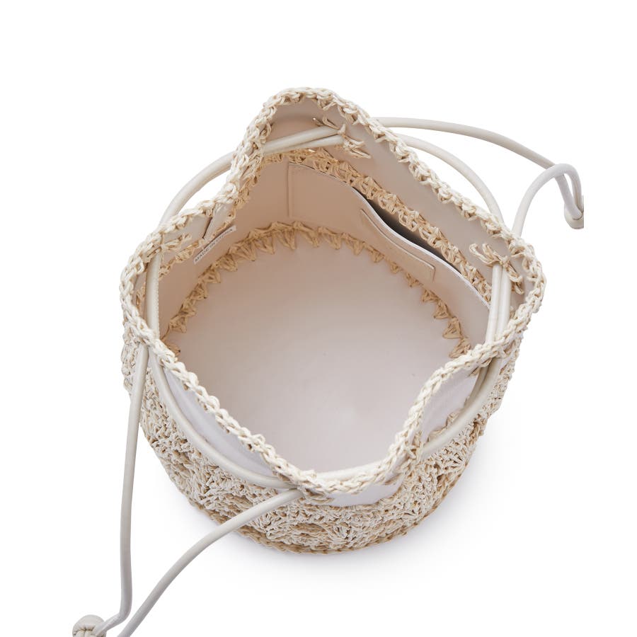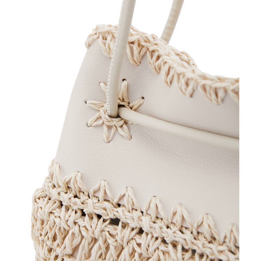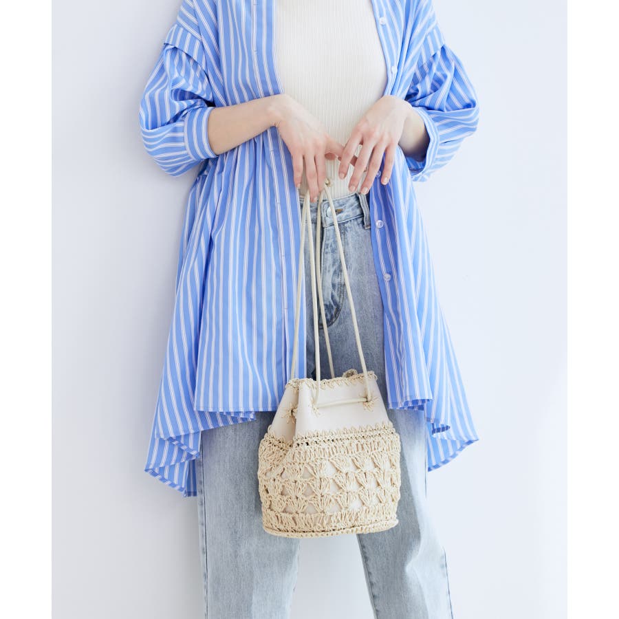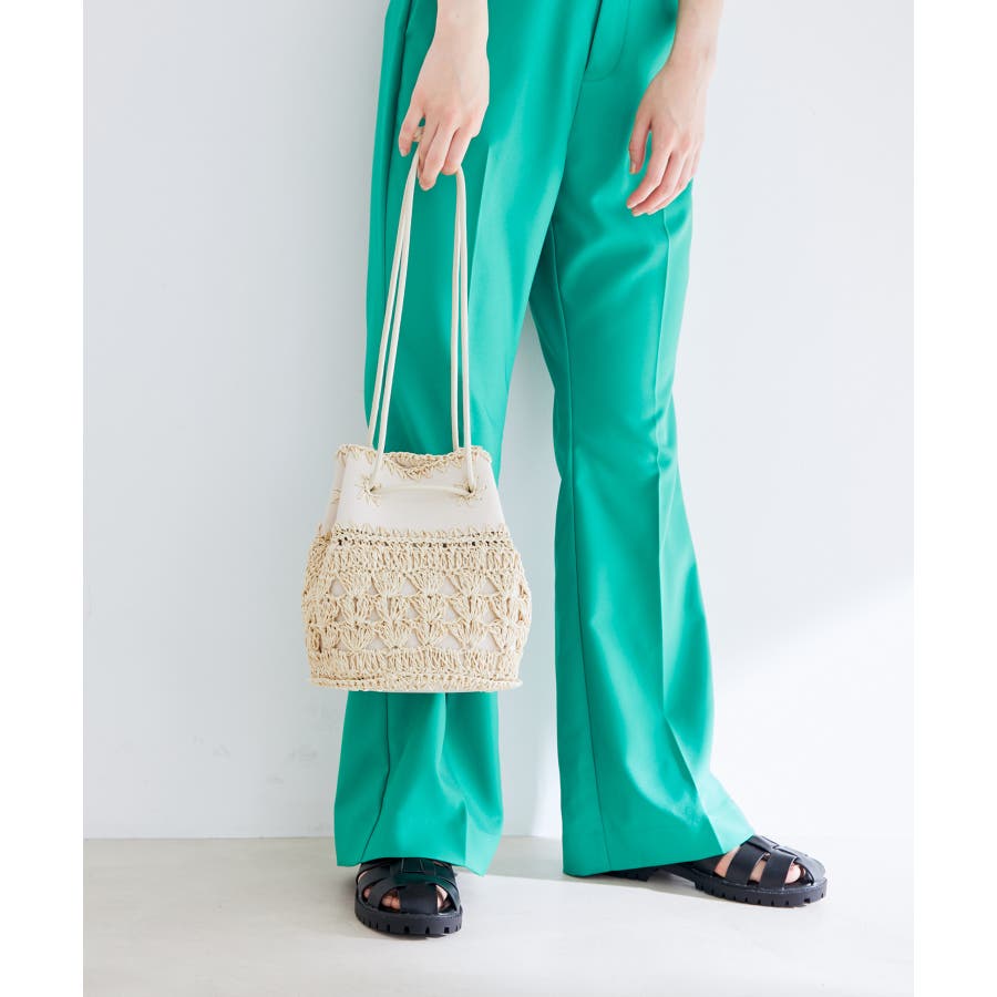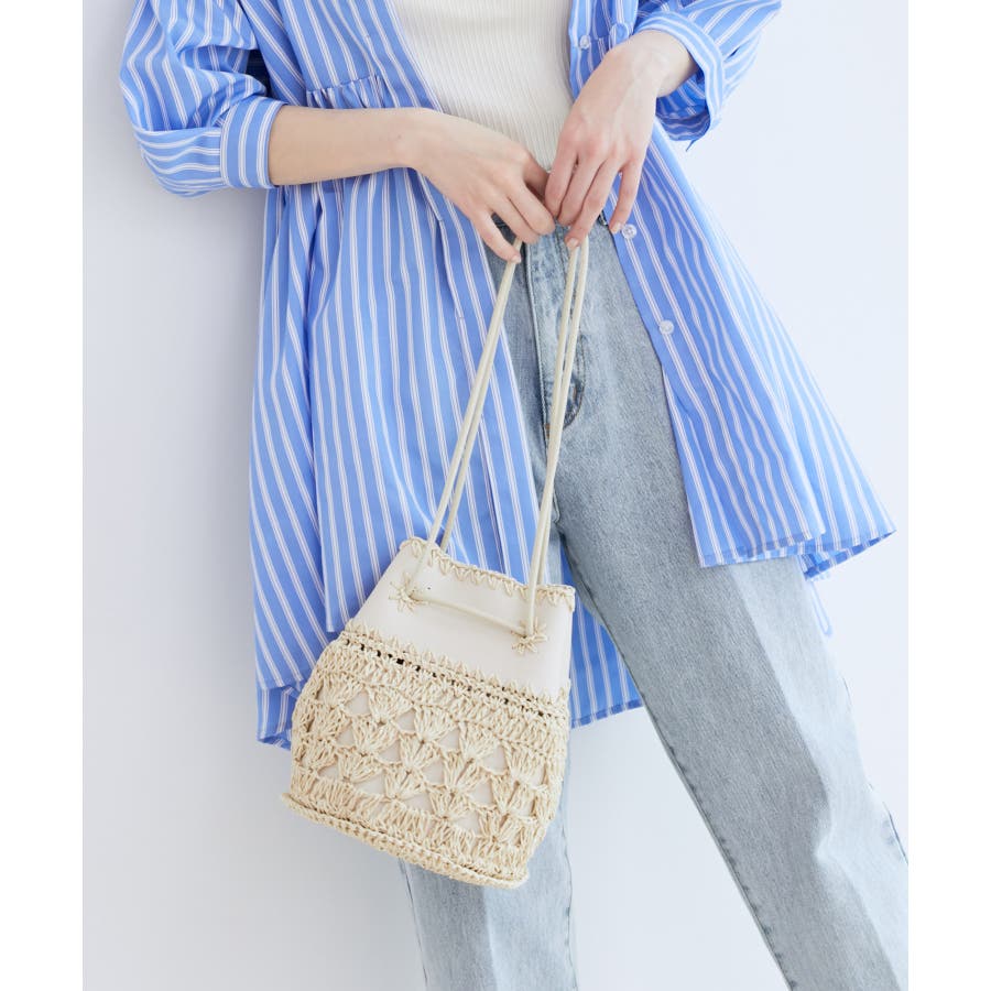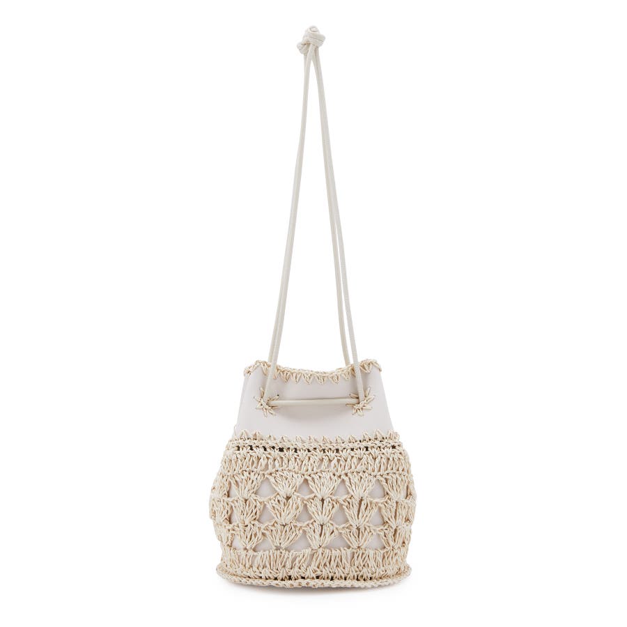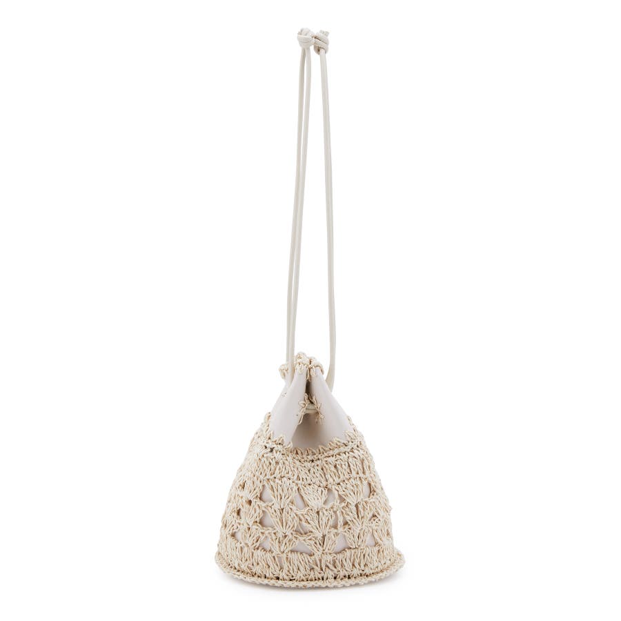 【デザイン・シルエット】 雑材を使用した異素材の巾着バッグです。 職人が1つ1つ編んで形成しているため若干の個体差がありますが、そこもまた味わいがあって素敵です。 長財布や500mlボトルも入るサイズ感です。 【素材】 アイボリーはフェイクレザーとペーパー、オレンジはビニールとペーパ-をかけ合わせています。 ----------------------------- ポケットの数:内×1 A4収納:不可能 長財布収納:可能 ショルダー紐:あり(長さ調節不可) ----------------------------- ※画像の商品はサンプルです。 実際の商品と仕様、加工、サイズが若干異なる場合がございます。
