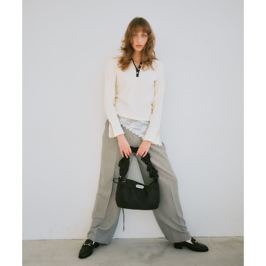 ギャザーを効かせたショルダーがポイントの、程よくラフなショルダーバッグ。ドロストでくしゅっとさせることで、スタイリングにさりげないニュアンスをプラス。