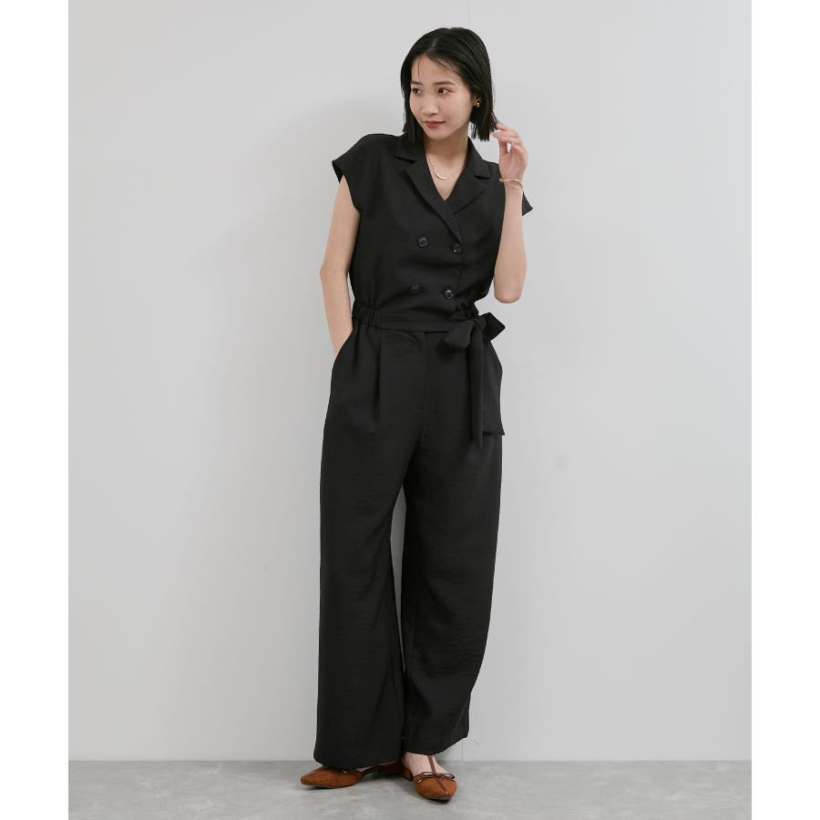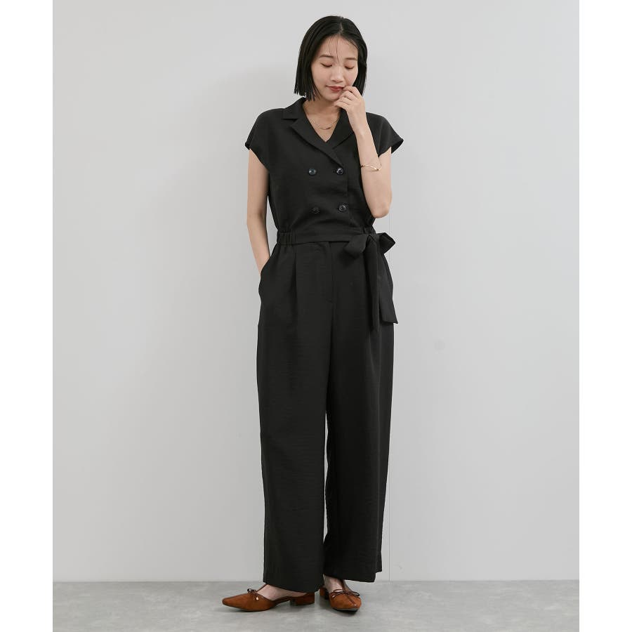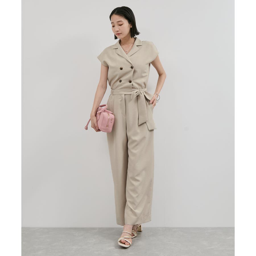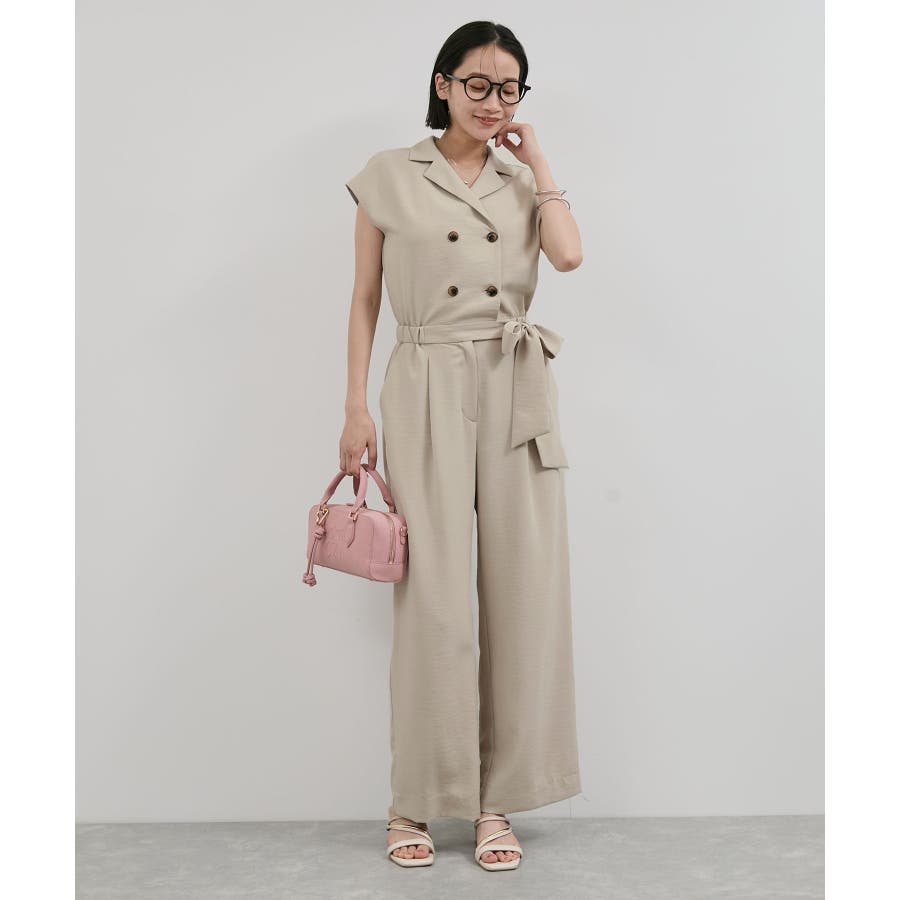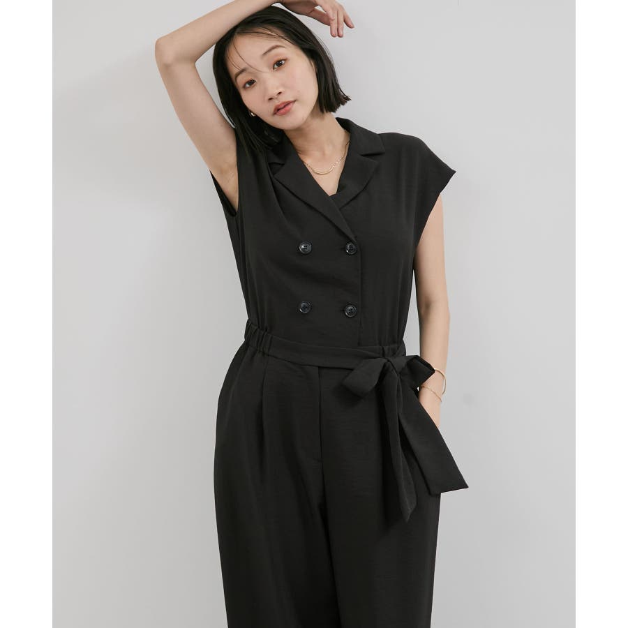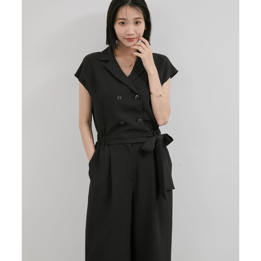 ダブル釦でスタイリッシュな雰囲気が素敵なオールインワン、かっちりしすぎないようにウエストをゴムにし柔らかい素材を使うことでオンオフどちらでも使えるデザインにしました。