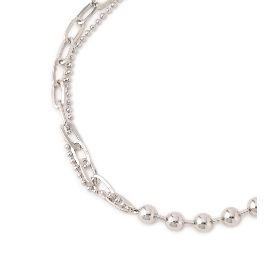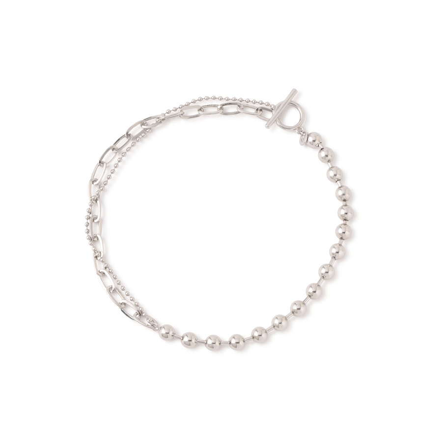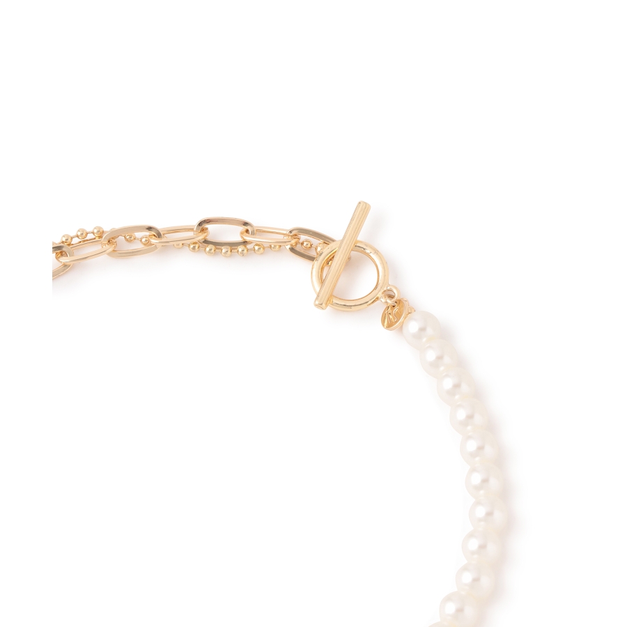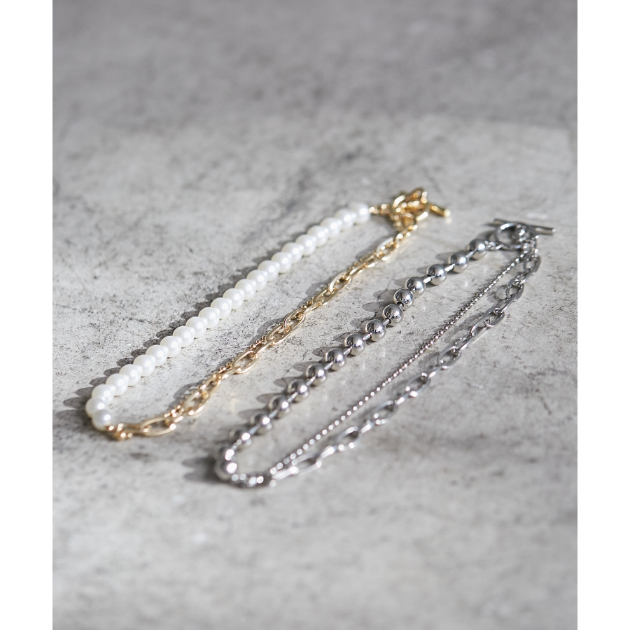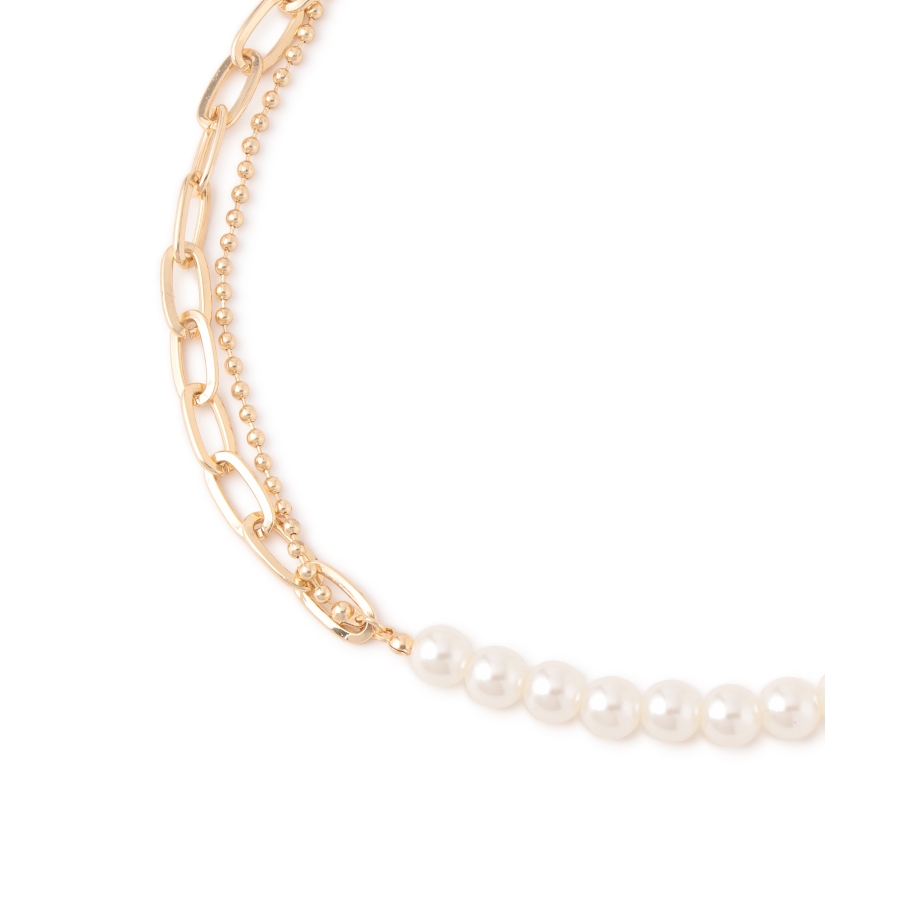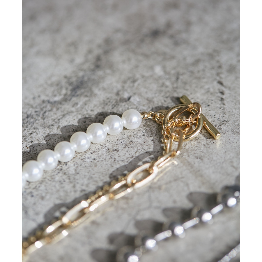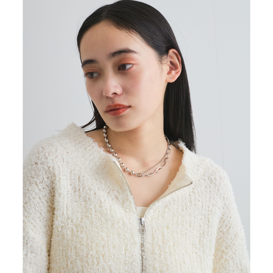 【デザイン・シルエット】 チェーンMIXで着けるだけで首元に程良い存在感を出してくれるネックレスです。 お洋服に合わせてお好きなフロントデザインを設定できるのと、ゴールドはパール・シルバーはメタルボールをチェーンを合わせることで、幅広いテイストのスタイリングにもマッチしてくれます。 ワンタッチで簡単に着脱できるのも嬉しいポイントです。 【カラー】 ゴールドとシルバーの2色展開です。 【おすすめのスタイリング】 カジュアルテイストはもちろん、程良いカジュアル感を出せるのであえて甘めなテイストのスタリングに合わせて頂くのもおすすめです。