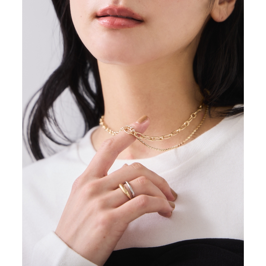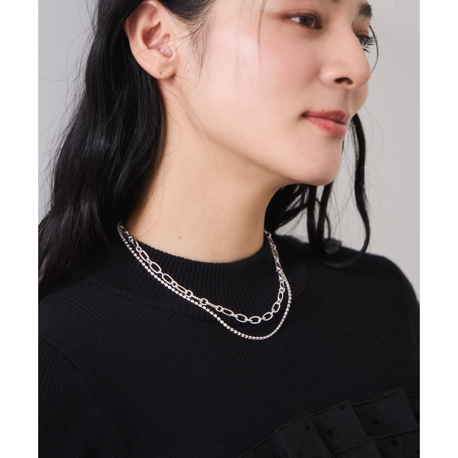ハイゲージニットや首回りが開いたトップスと合わせて頂くのがおすすめです。