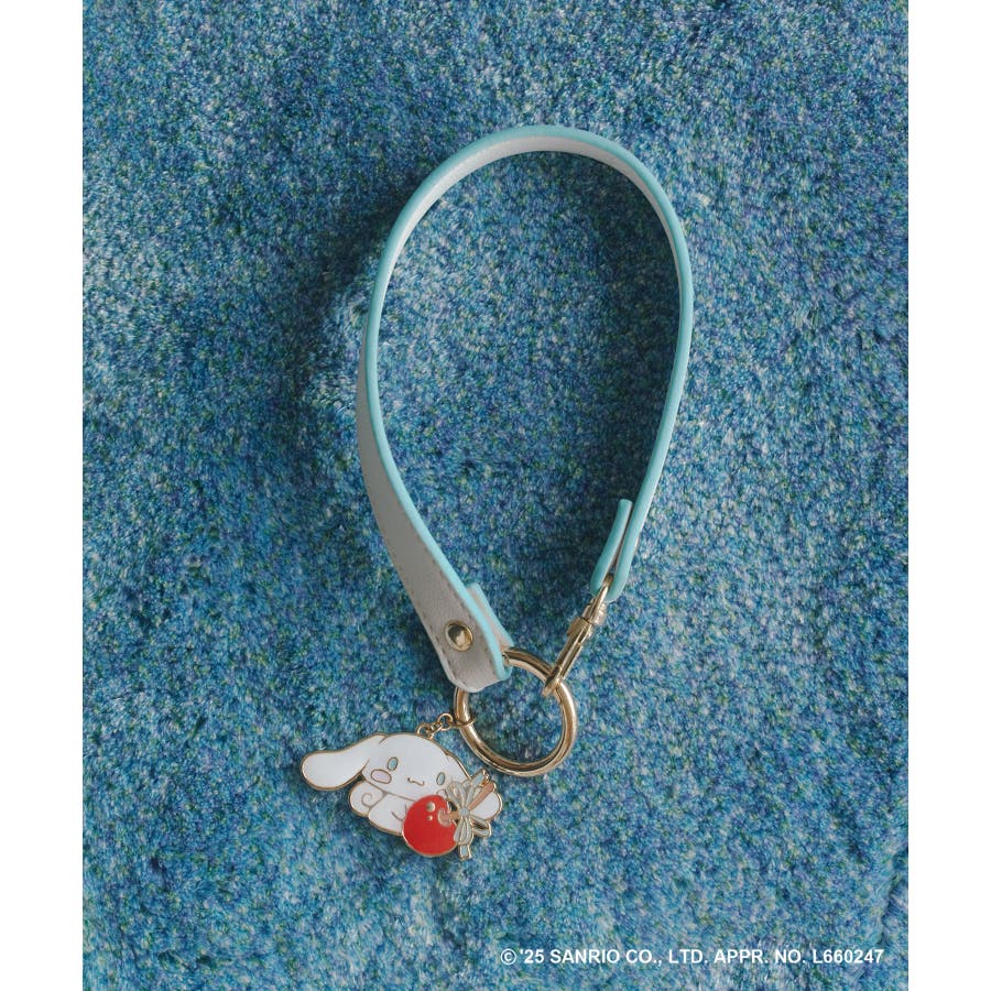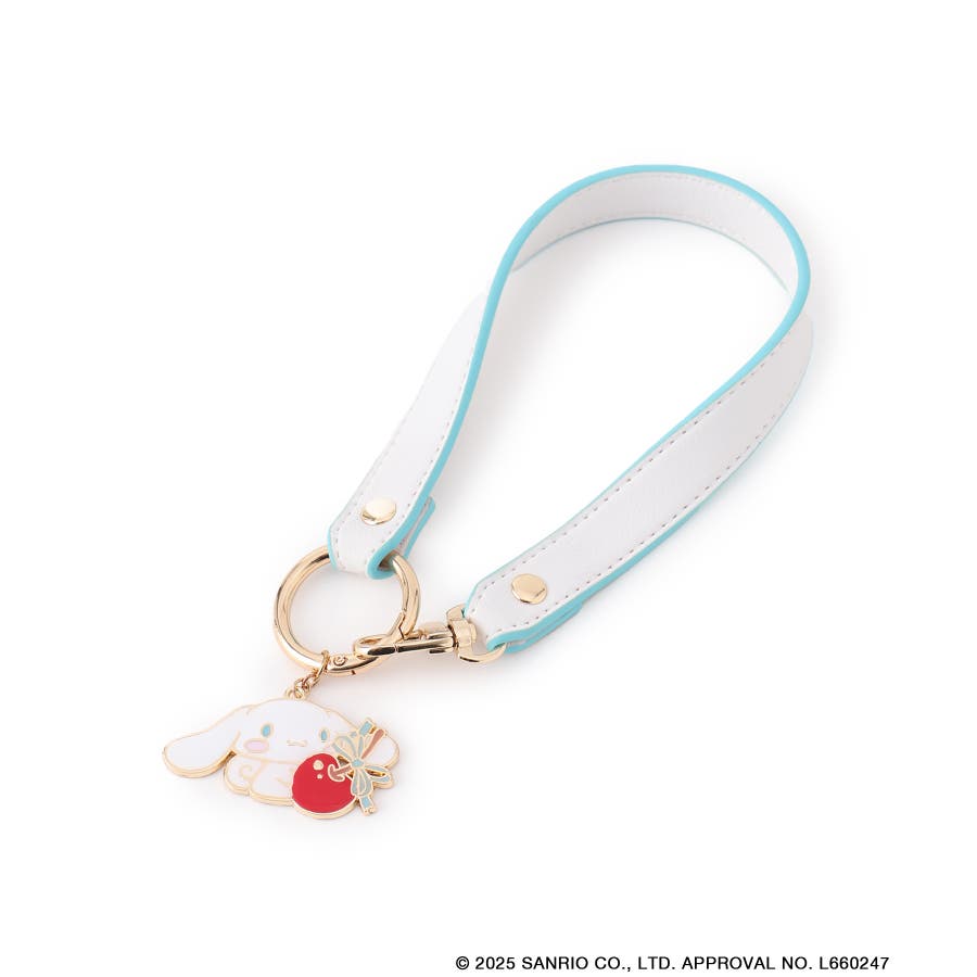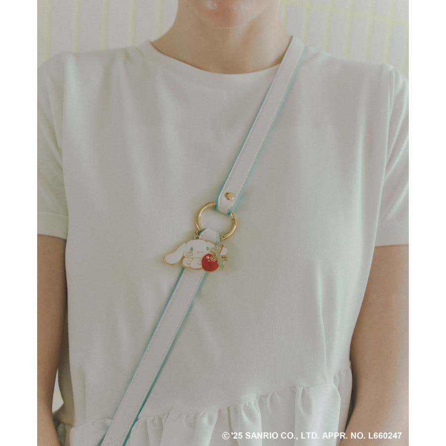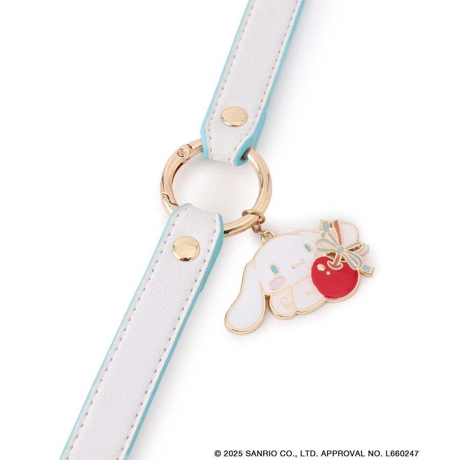 ・チェリーを抱えたシナモロールのチャームはショルダーでもハンドストラップでも取り付け可能。丸カラビナ仕様で、気分に合わせて自由に付け替えられます。