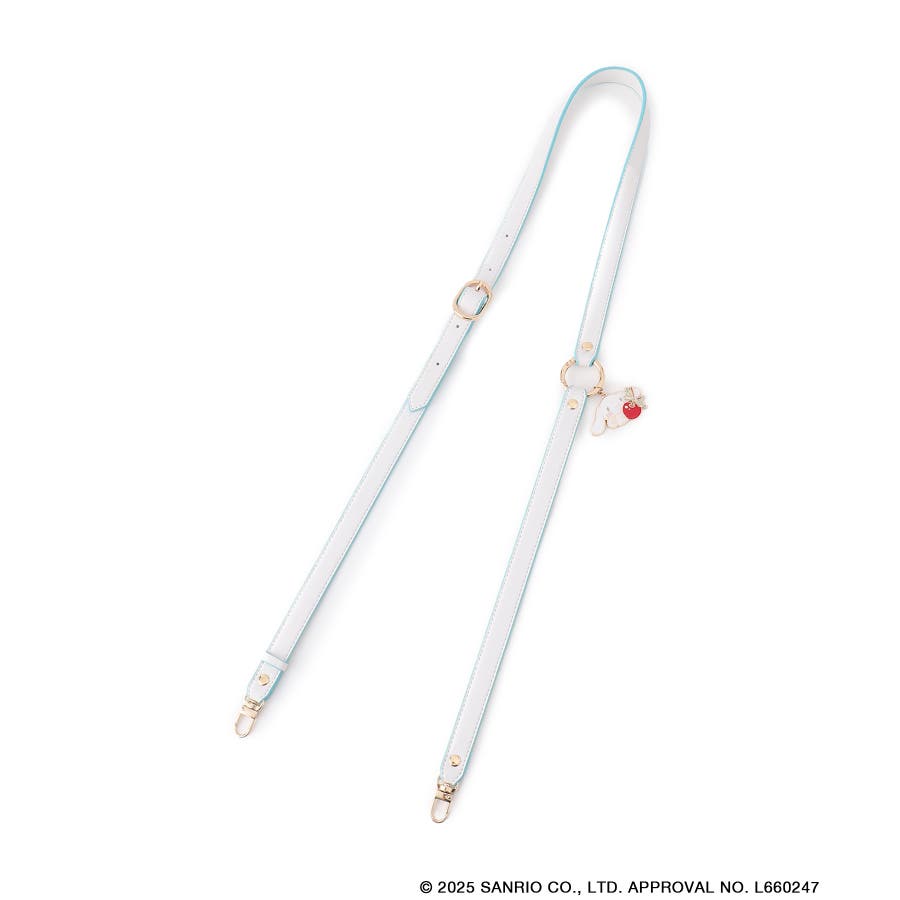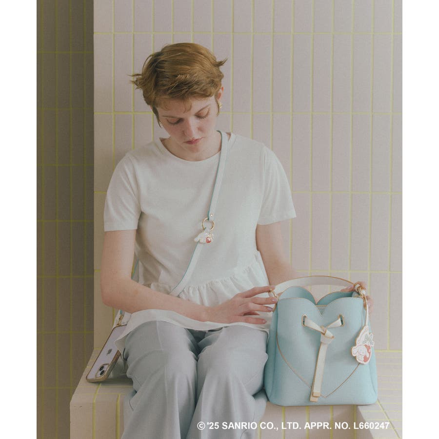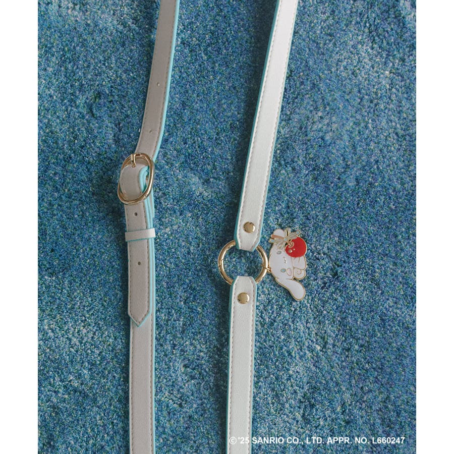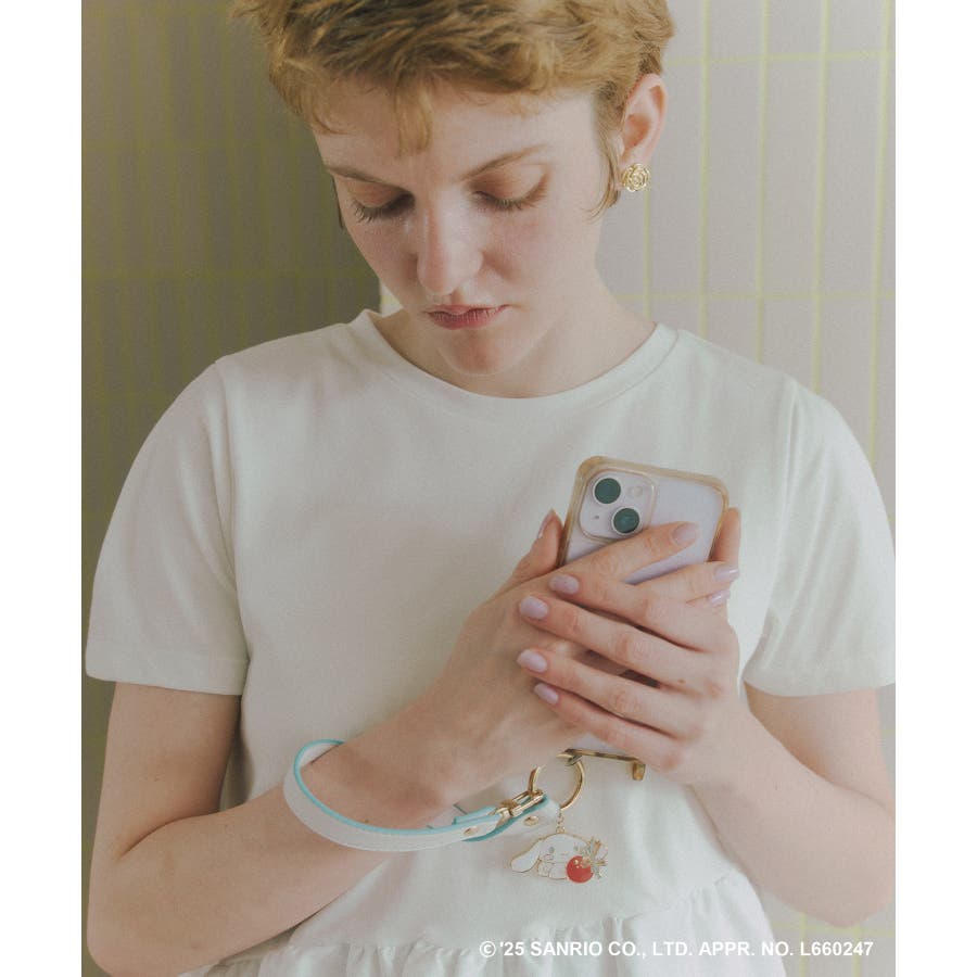 ・チェリーを抱えたシナモロールのチャームはショルダーでもハンドストラップでも取り付け可能。丸カラビナ仕様で、気分に合わせて自由に付け替えられます。