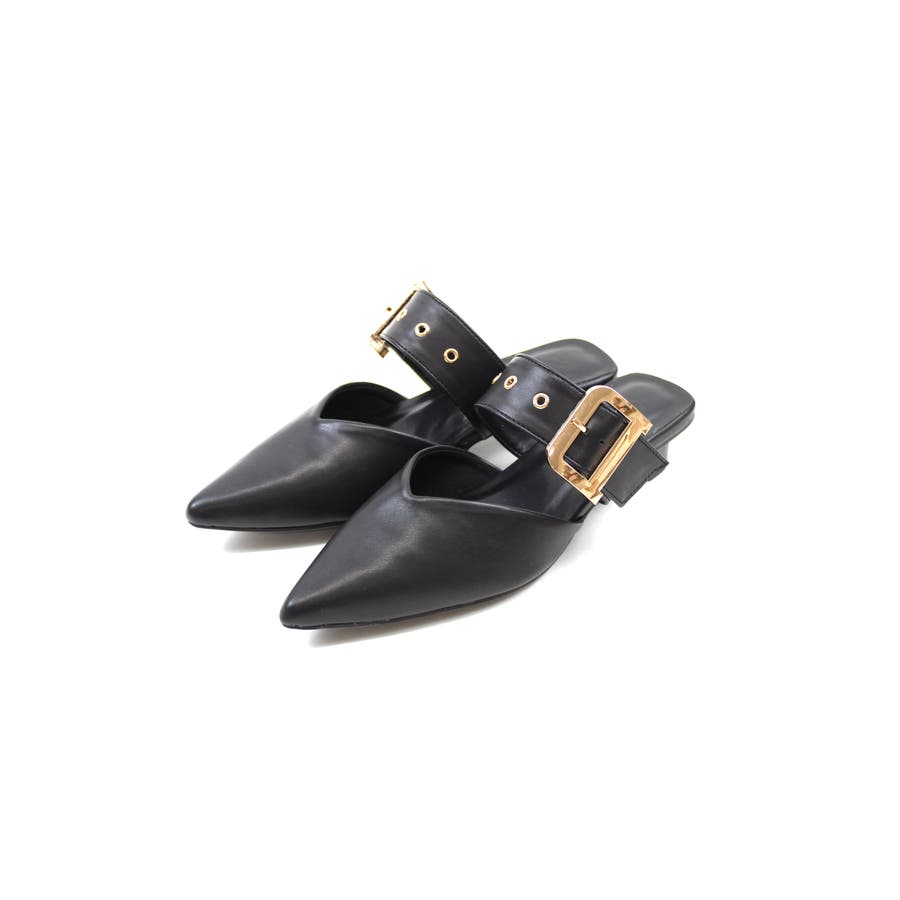 ポインテッドトゥvカットバックルベルトミュールパンプス