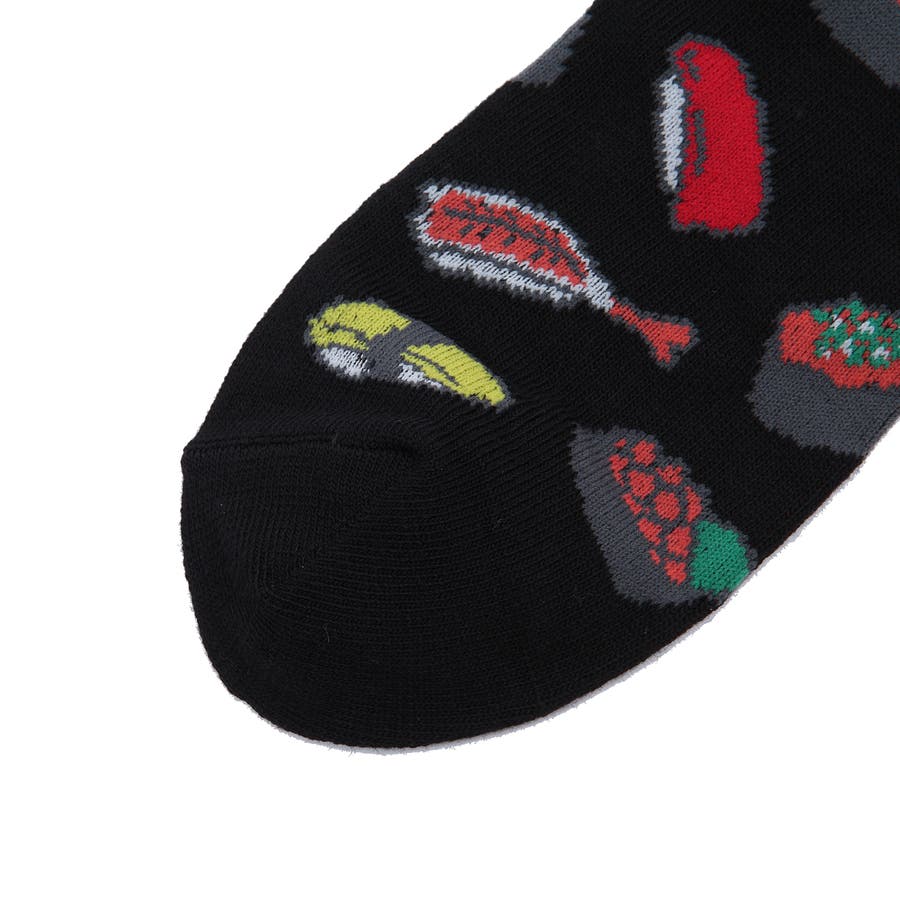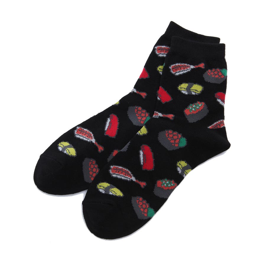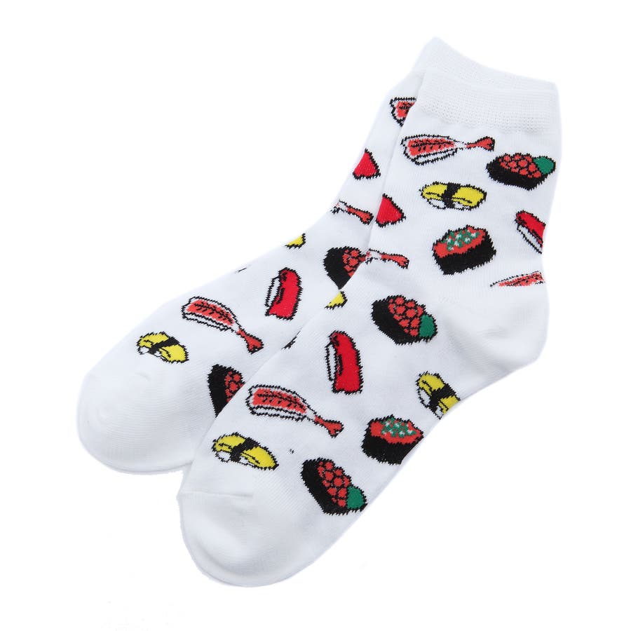 全面に寿司柄を落とし込んだソックス。柔らかく脚のラインにフィットし、ストレスなく快適に着用頂けます。クウォーター丈の程よい長さのソックスはパンプスやフラットシューズと合わせたり、ロ-ルアップしてチラリと覗かせる様な着こなしもオススメ。お値段も手頃で、コストパフォーマンスにも優れたアイテムです。