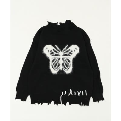 大胆なバタフライ柄とダメージ加工が融合した、存在感抜群のアートニット。