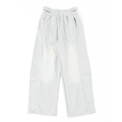 ウエスト部分のカットデザインと、脚のラインに沿ったカーブシルエットがポイントの“こなれスウェットパンツ”。