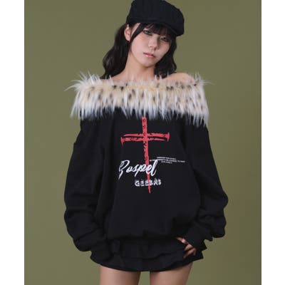 ふわふわのフェイクファーが首元を華やかに彩る、オフショルダーデザインのクロスロゴプルオーバー。