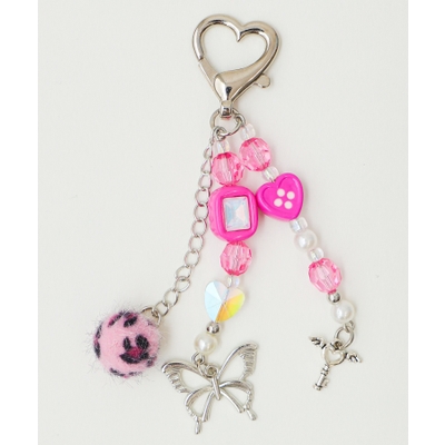 ビーズやハートモチーフ、ふわふわのレオパード柄ぽんぽんが組み合わさった“レオパードぽんぽんビーズキーホルダー”。