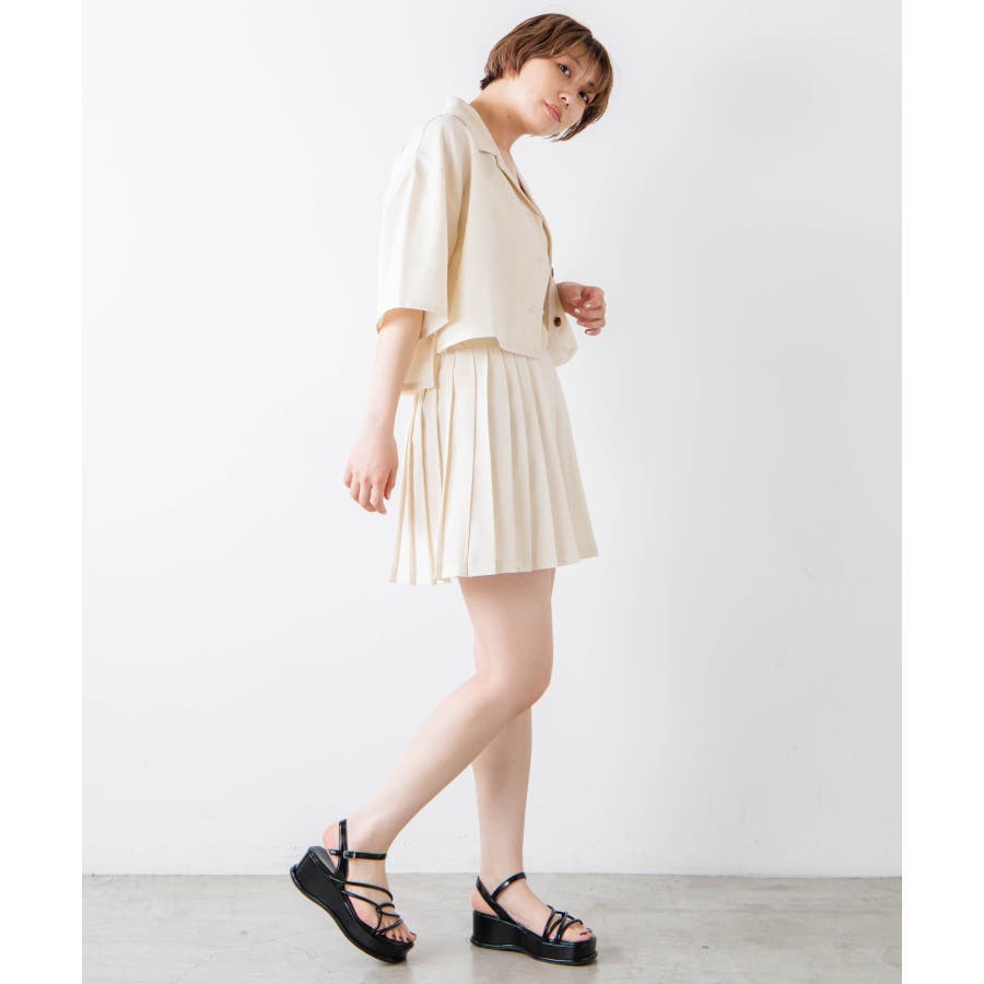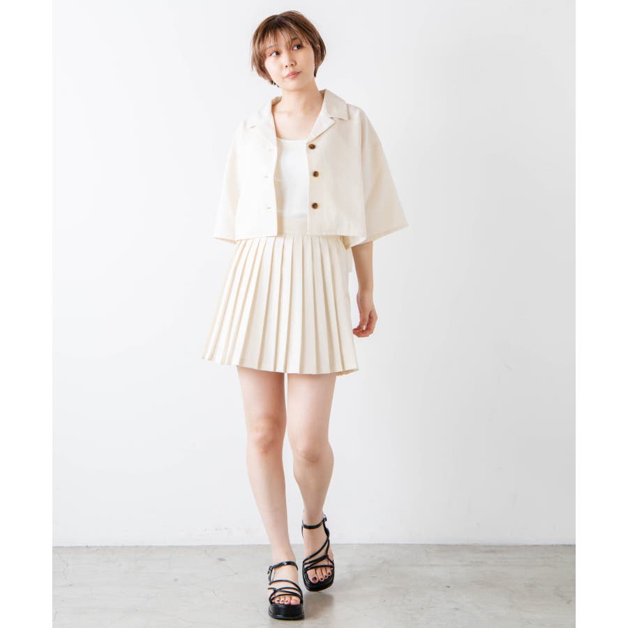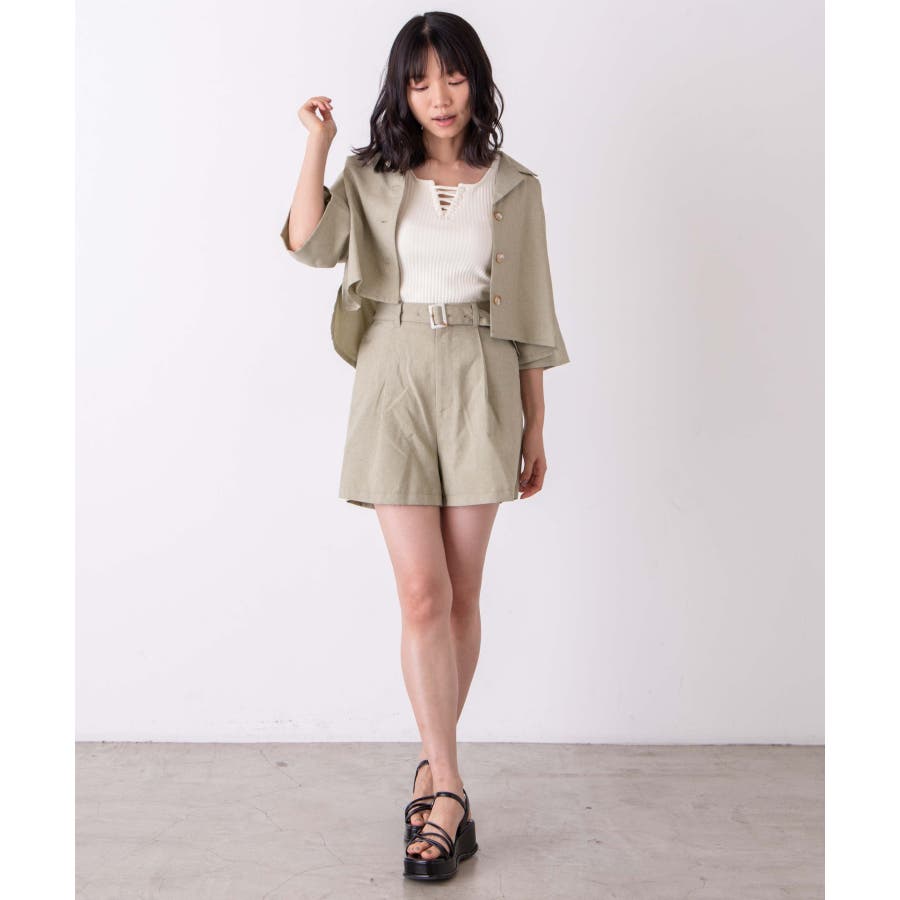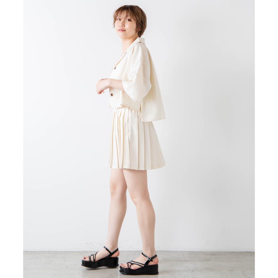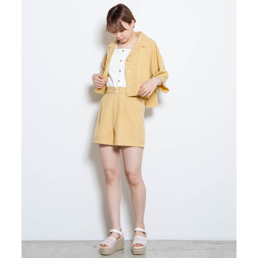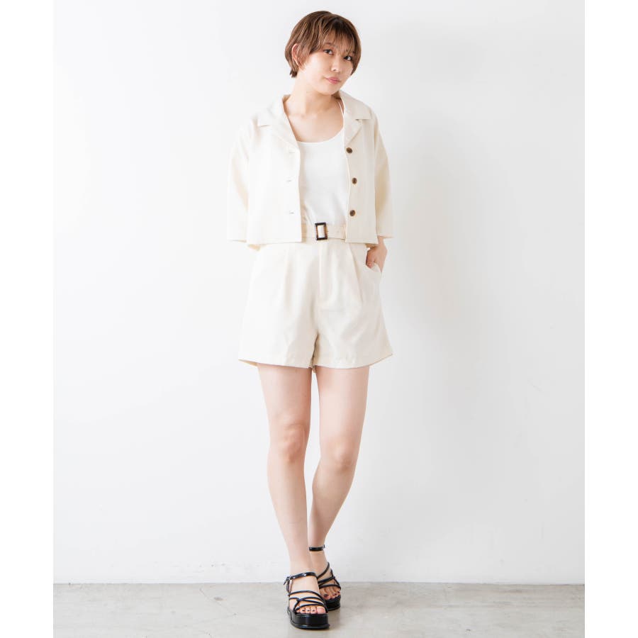 同素材のプリーツミニスカパン、ベルト付きショートパンツとセットアップ可能。