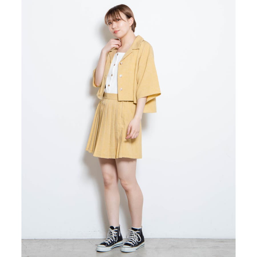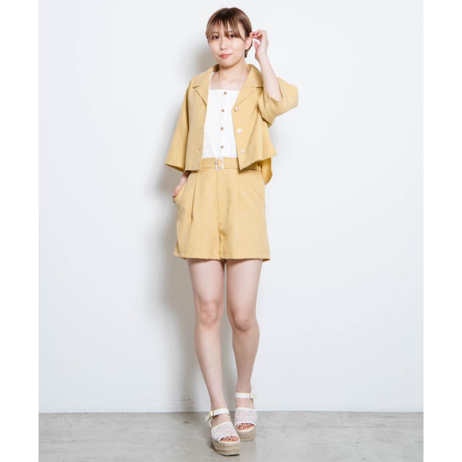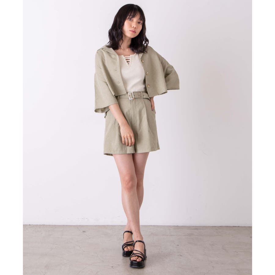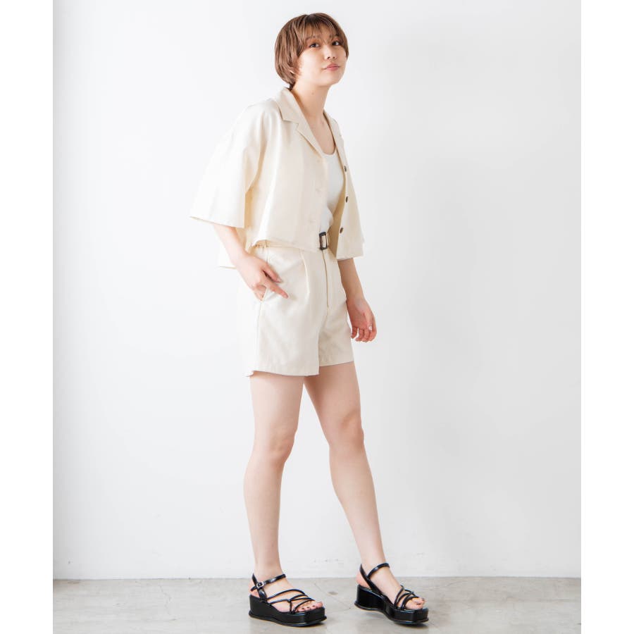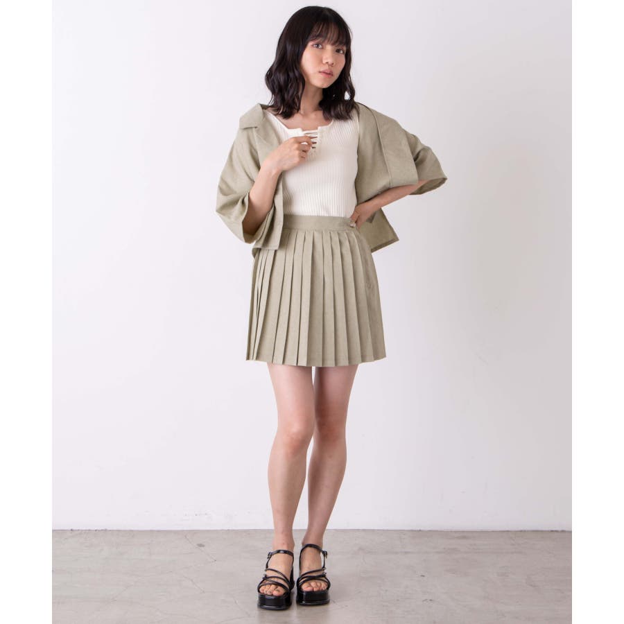 同素材のプリーツミニスカパン、ベルト付きショートパンツとセットアップ可能。