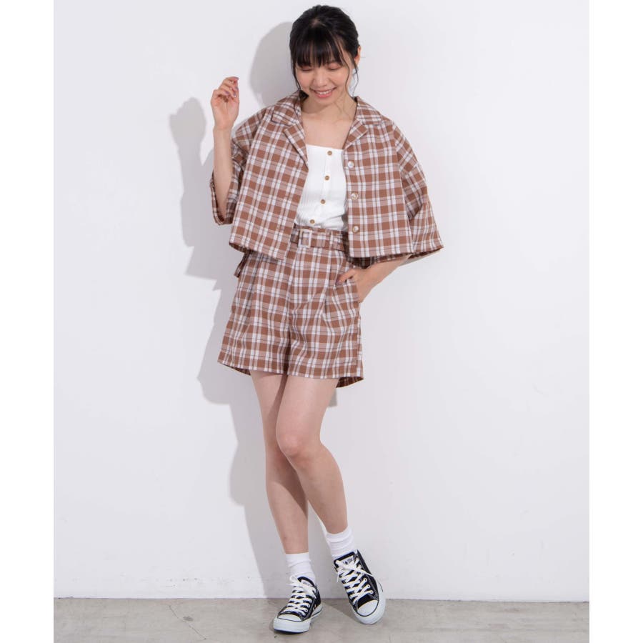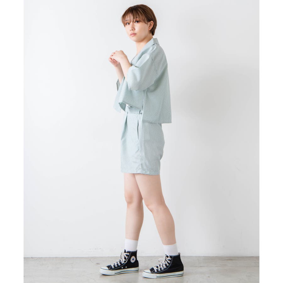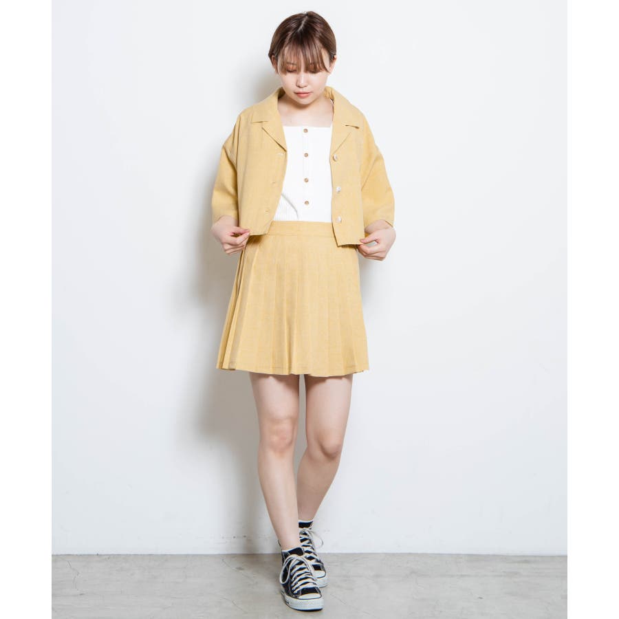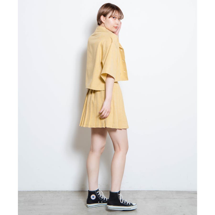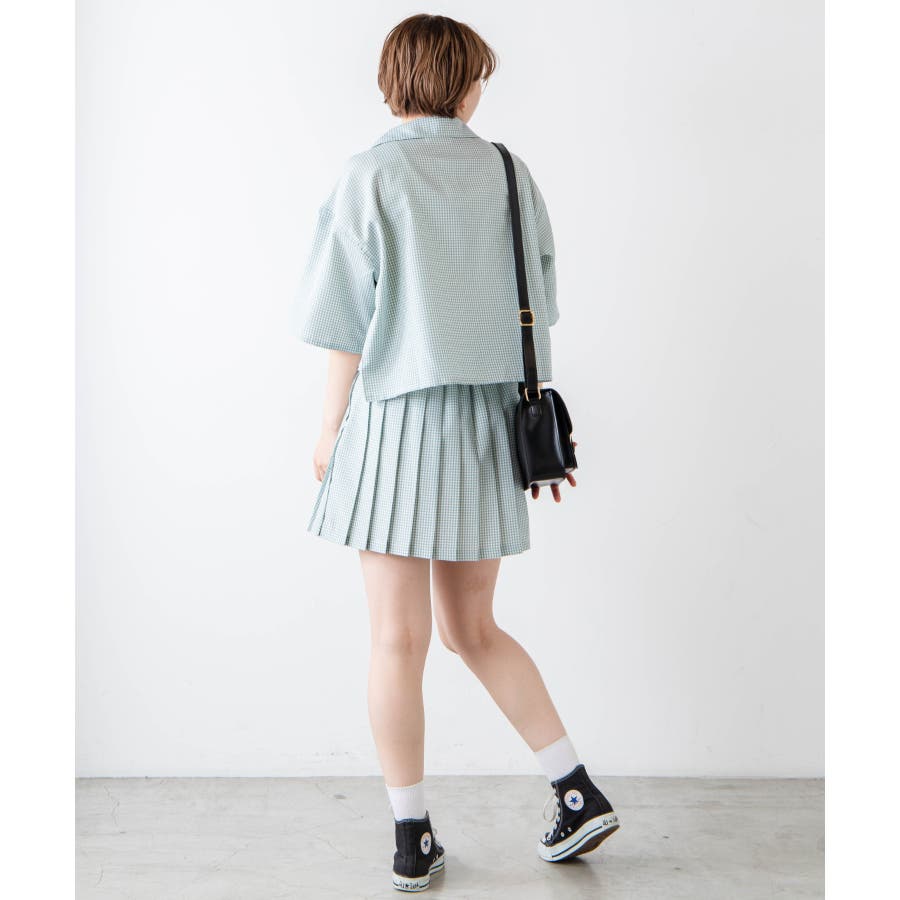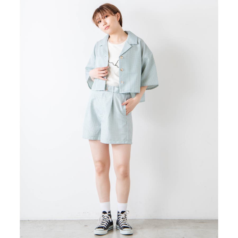 同素材のプリーツミニスカパン、ベルト付きショートパンツとセットアップ可能。