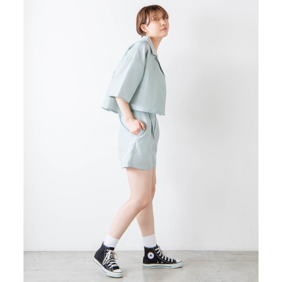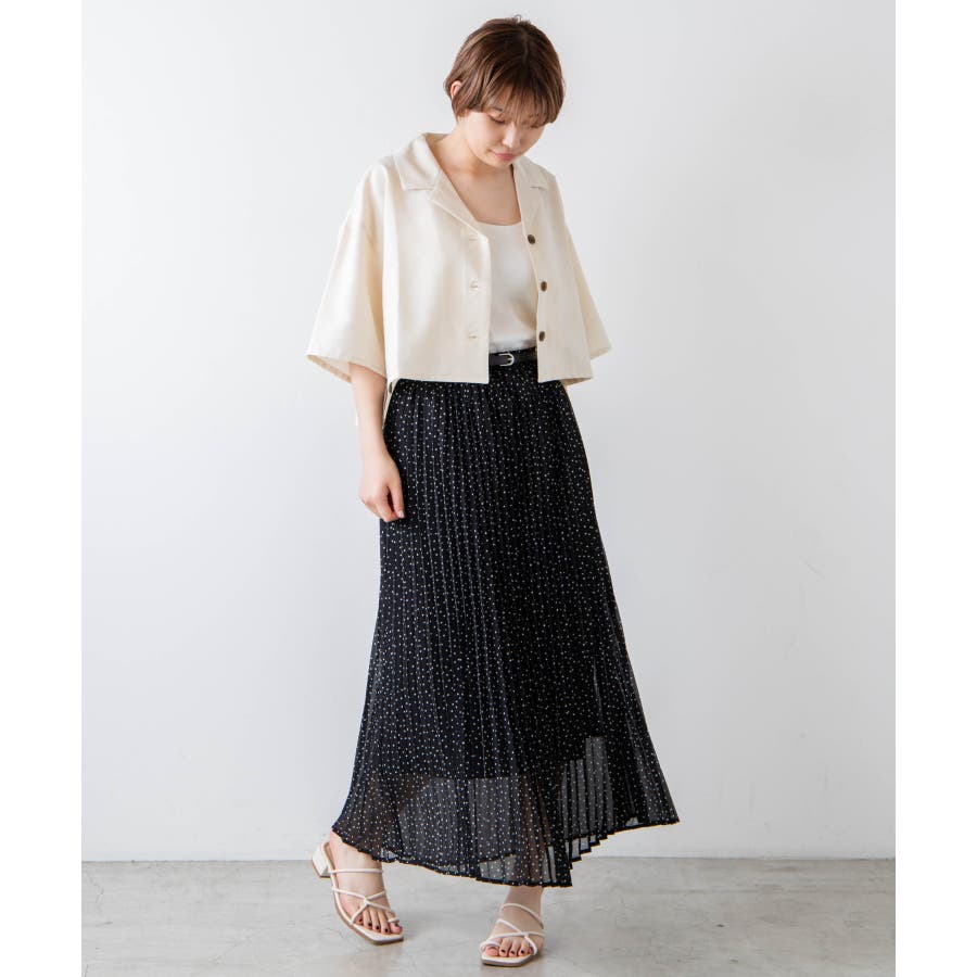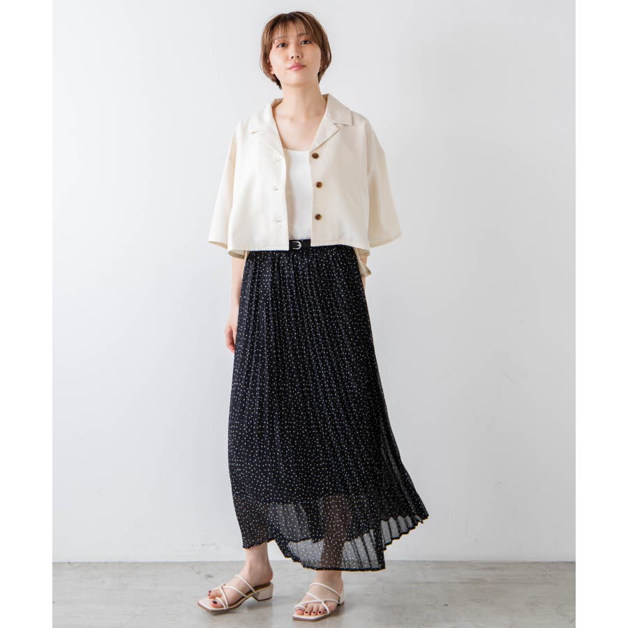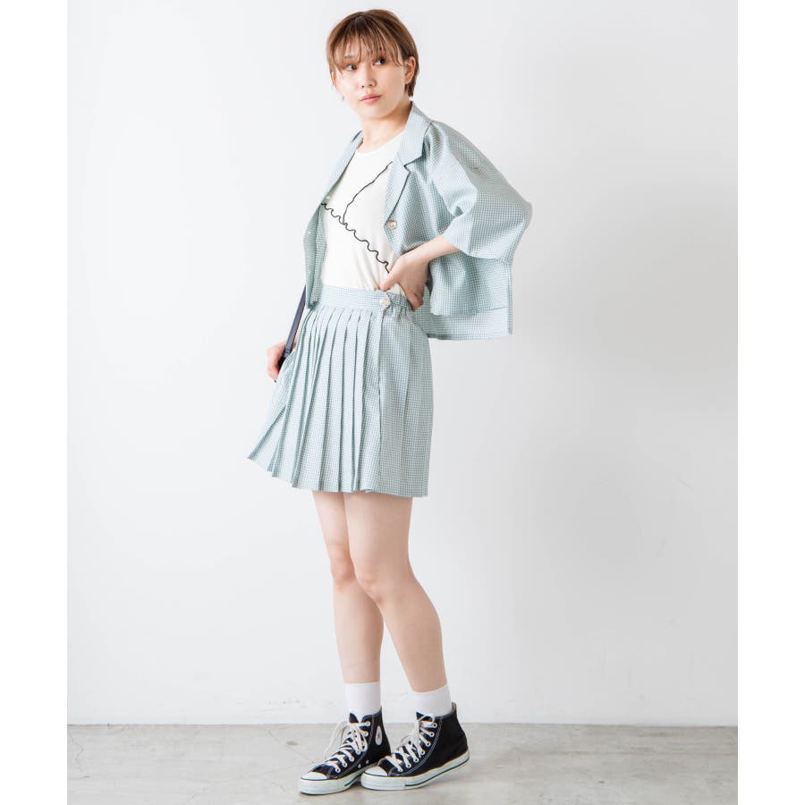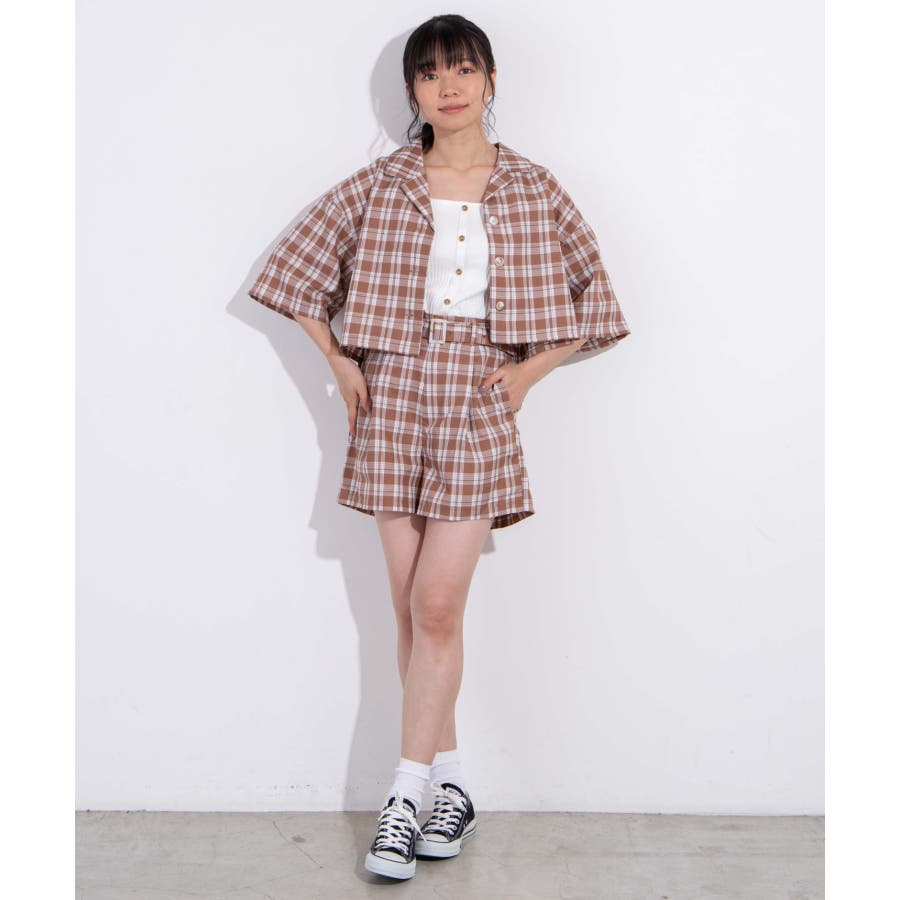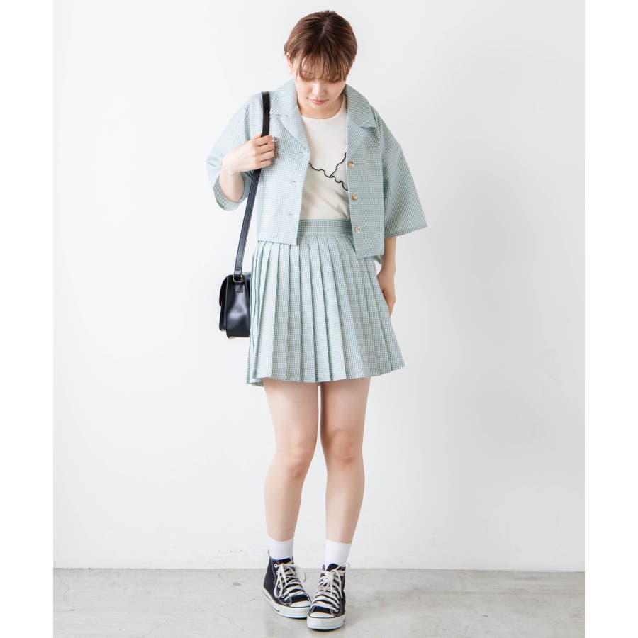 同素材のプリーツミニスカパン、ベルト付きショートパンツとセットアップ可能。