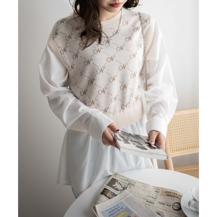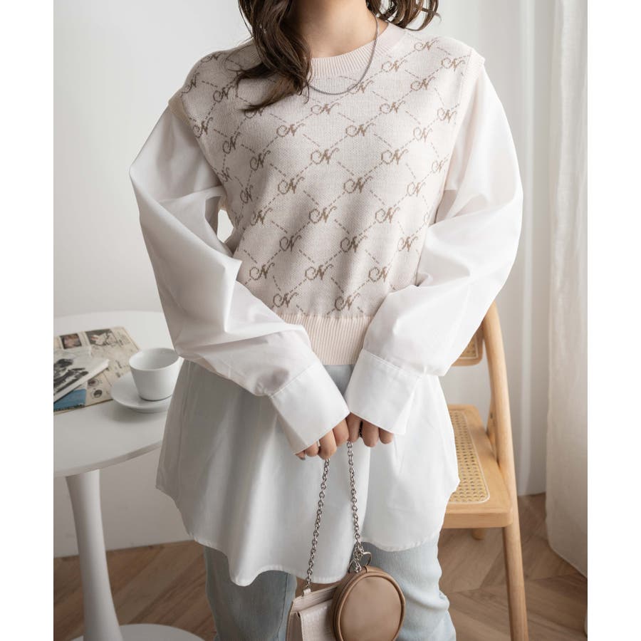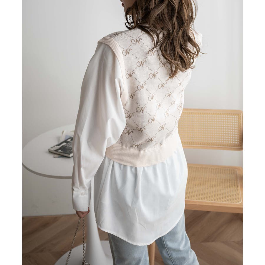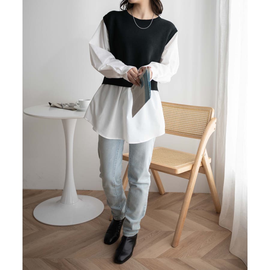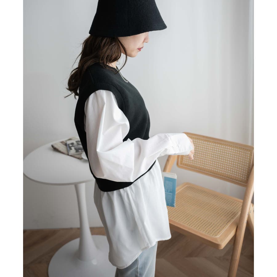 シャツチュニックをレイヤードさせたドッキングニットベスト。