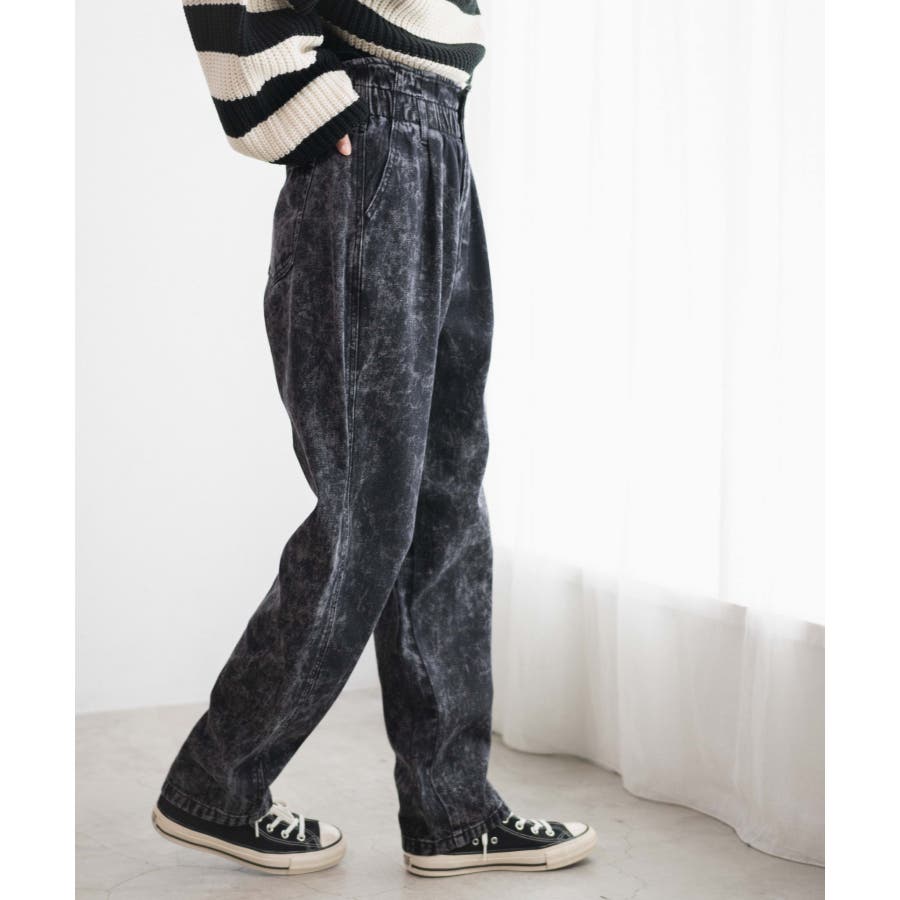 少し長めの股下でルーズ感はあるが、ゆるいテーパードシルエットですっきりした印象!ウエストフリルデザインで、ウエスト位置を高く見せスタイルアップ&コーデのワンポイントに。