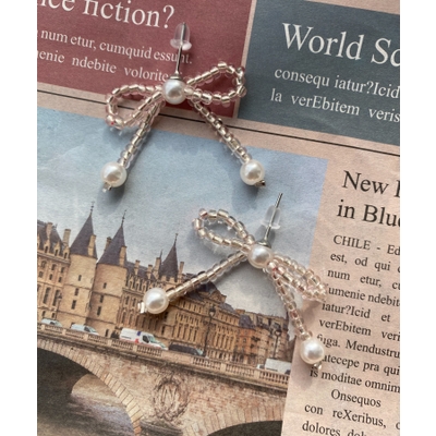 今人気のリボンモチーフをビーズでかたどったデザインのピアス。