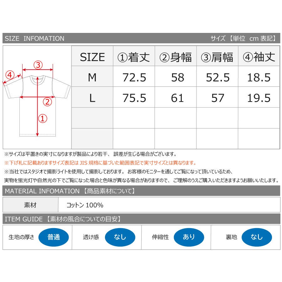 | 【Mサイズ】 ・着丈72.5cm/・身幅58cm/・肩幅52.5cm・袖丈18.5cm 【Lサイズ】 ・着丈75.5cm/・身幅61cm/・肩幅57cm・袖丈19.5cm |