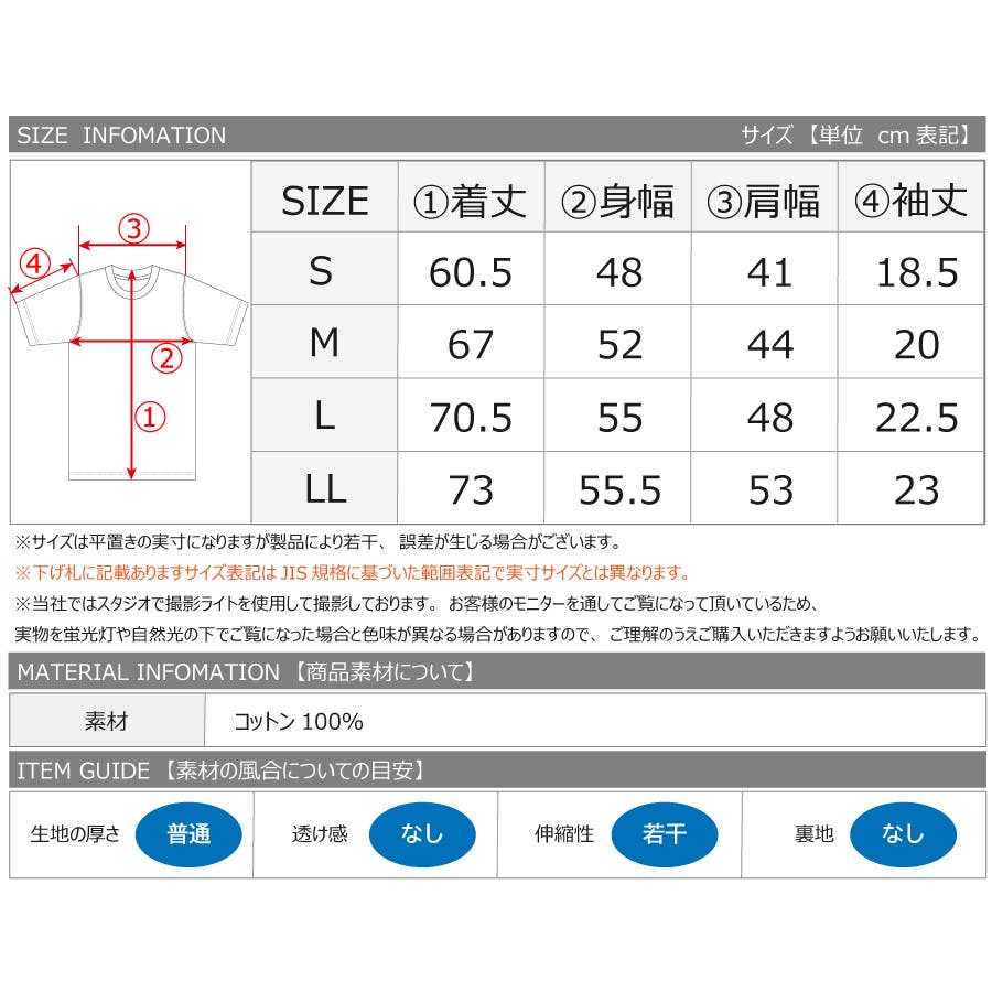 | 【Sサイズ】 ・着丈60.5cm/・身幅48cm/・肩幅41cm・袖丈18.5cm 【Mサイズ】 ・着丈67cm/・身幅52cm/・肩幅44cm・袖丈20cm 【Lサイズ】 ・着丈70.5cm/・身幅55cm/・肩幅48cm・袖丈22.5cm 【LLサイズ】 ・着丈73cm/・身幅55.5cm/・肩幅53cm・袖丈23cm |