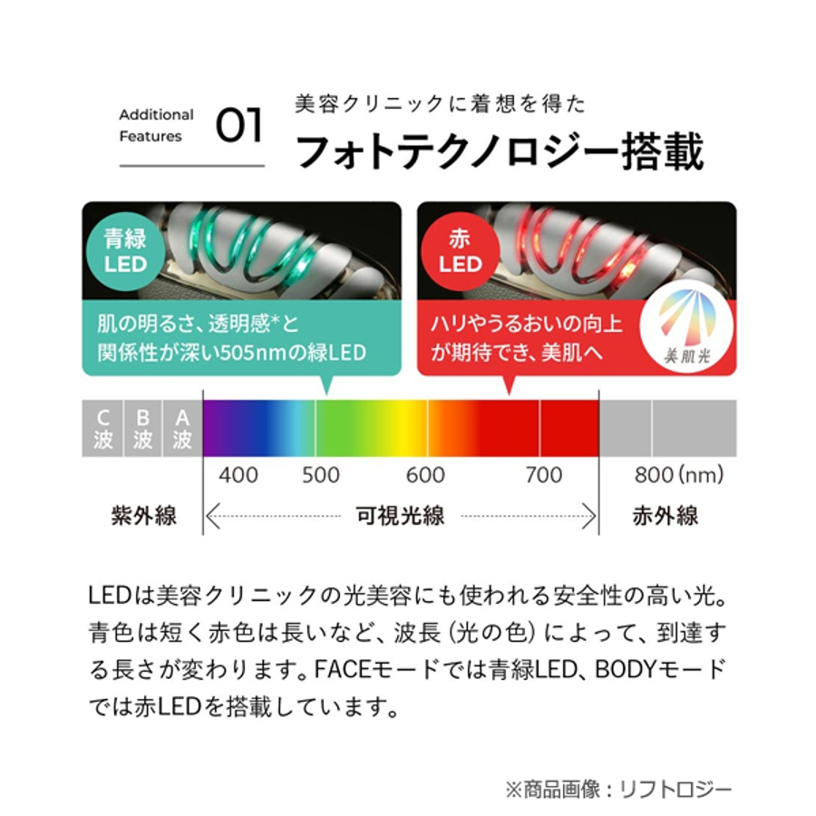 FACEモードでは青緑LED、BODYモードでは赤LEDを搭載しています。