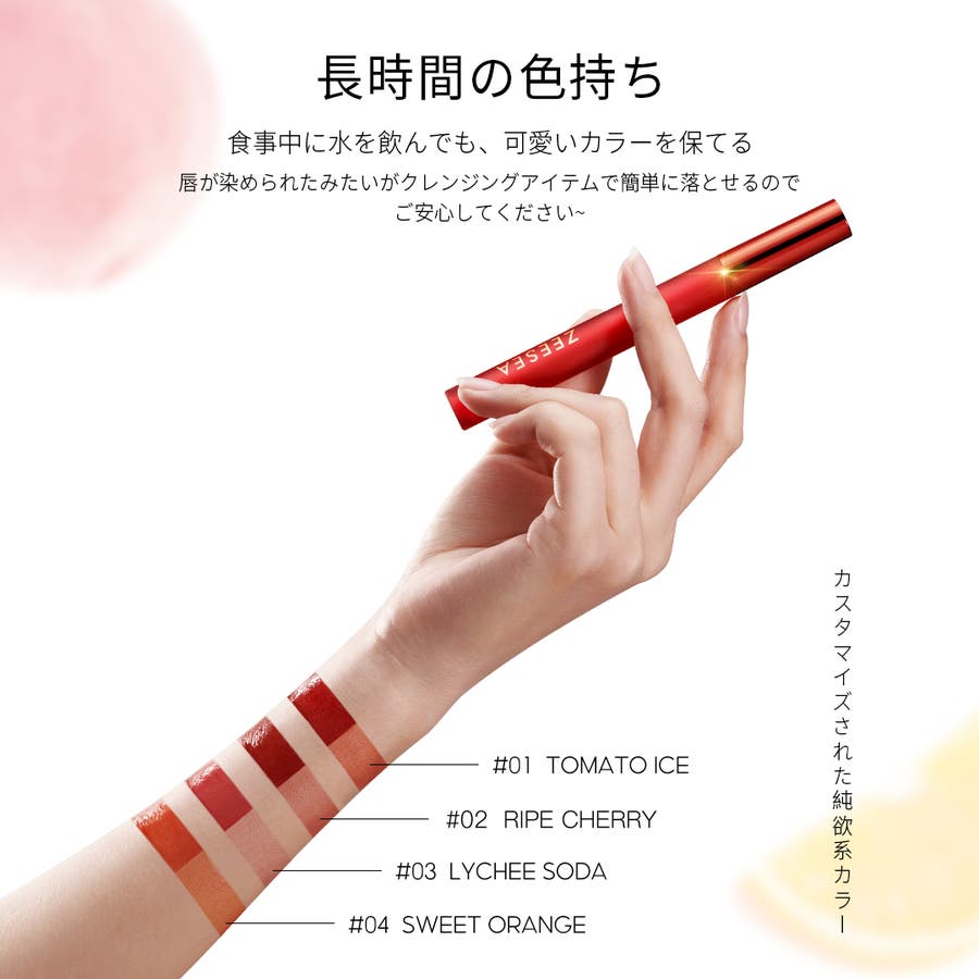 | カラー | 01 TOMATO ICE / 02 RIPE CHERRY / 03 LYCHEE SODA / 04 SWEET ORANGE |